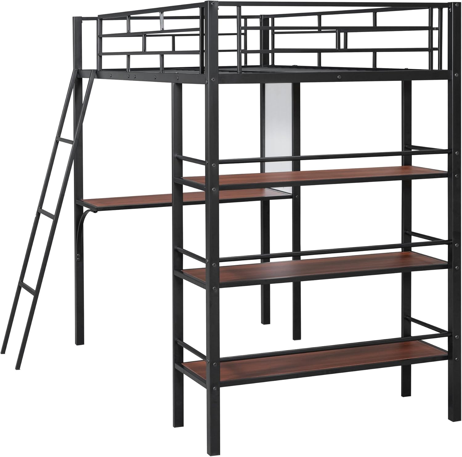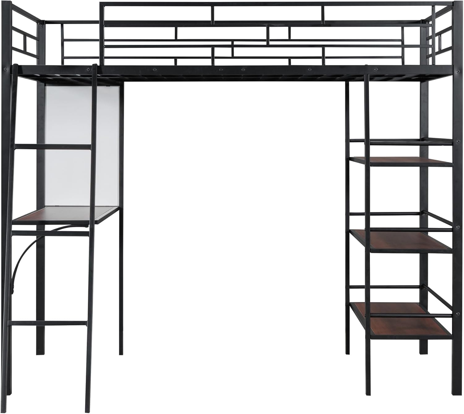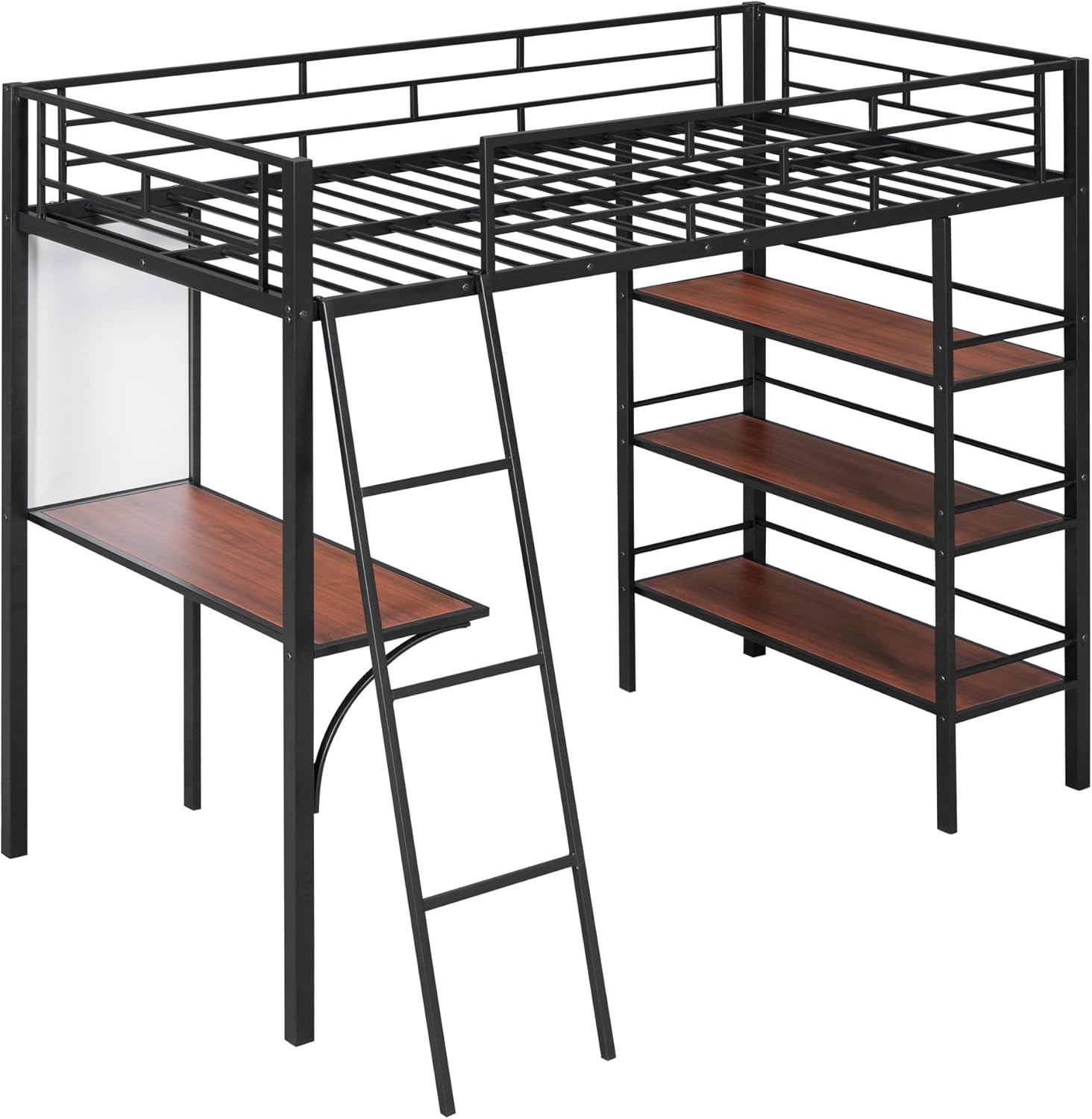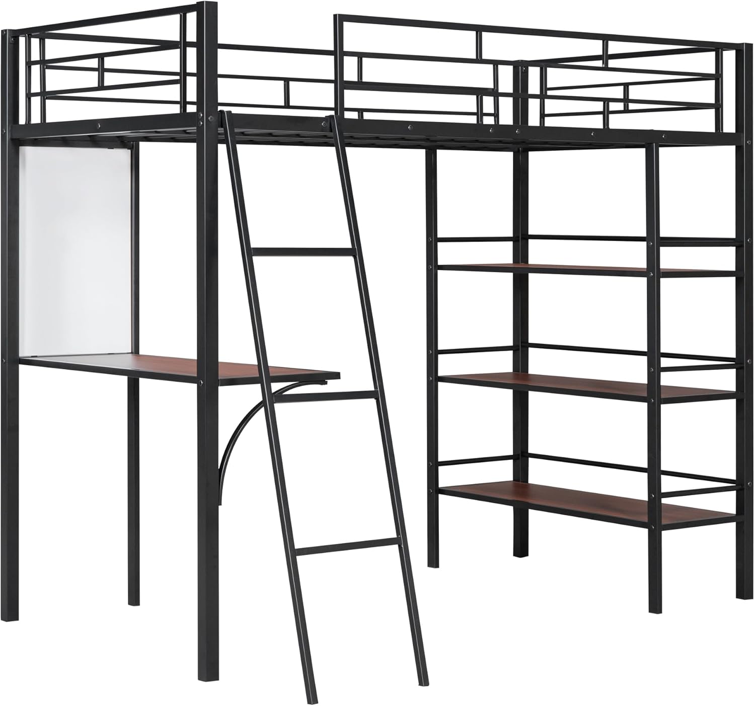 Twin Size Loft Bed Metal with Desk and Storage Shelves, with 3 Layers, Space Saving with Underneath and Whiteboard, High Loft Bed for Junior & Teens