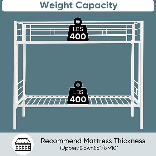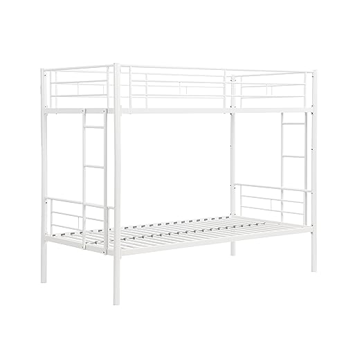 Dolonm Twin Over Twin Metal Bunk Bed, Metal Bed frame with Safety Guardrails and 2 Ladders, Convertible Bunkbeds, No Spring Box Required, Space Saving Design, White