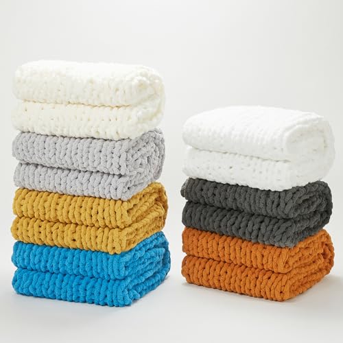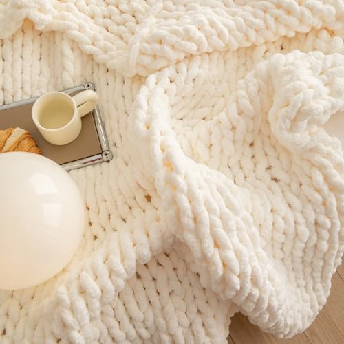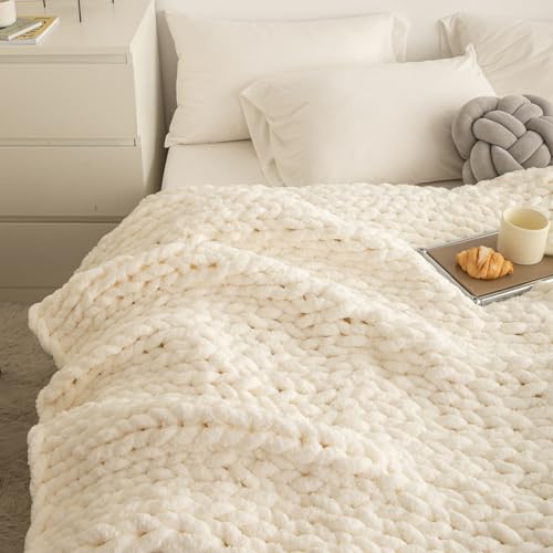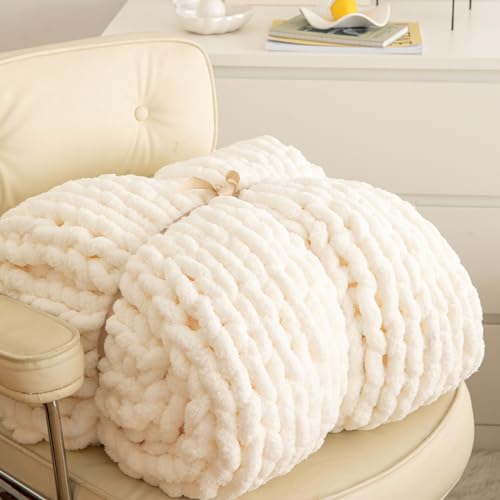 Chunky Knit Blanket Luxury Cozy Chenille Throws - Warm Soft Handmade Knitted Throw Blankets for Couch,Bed,Sofa,Boho Home Decor(51"x63",Creamy White)