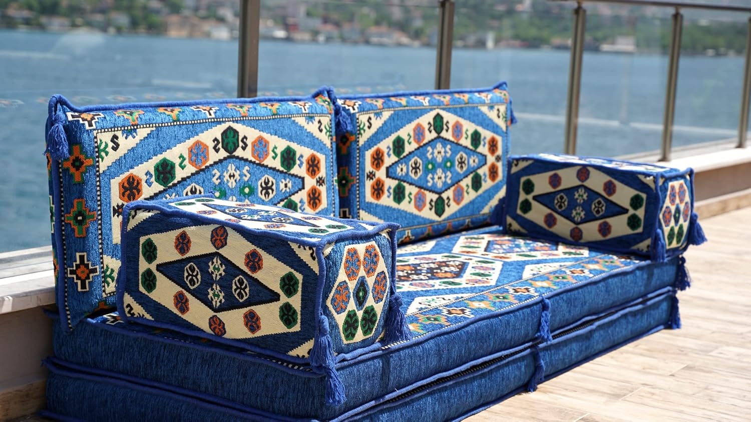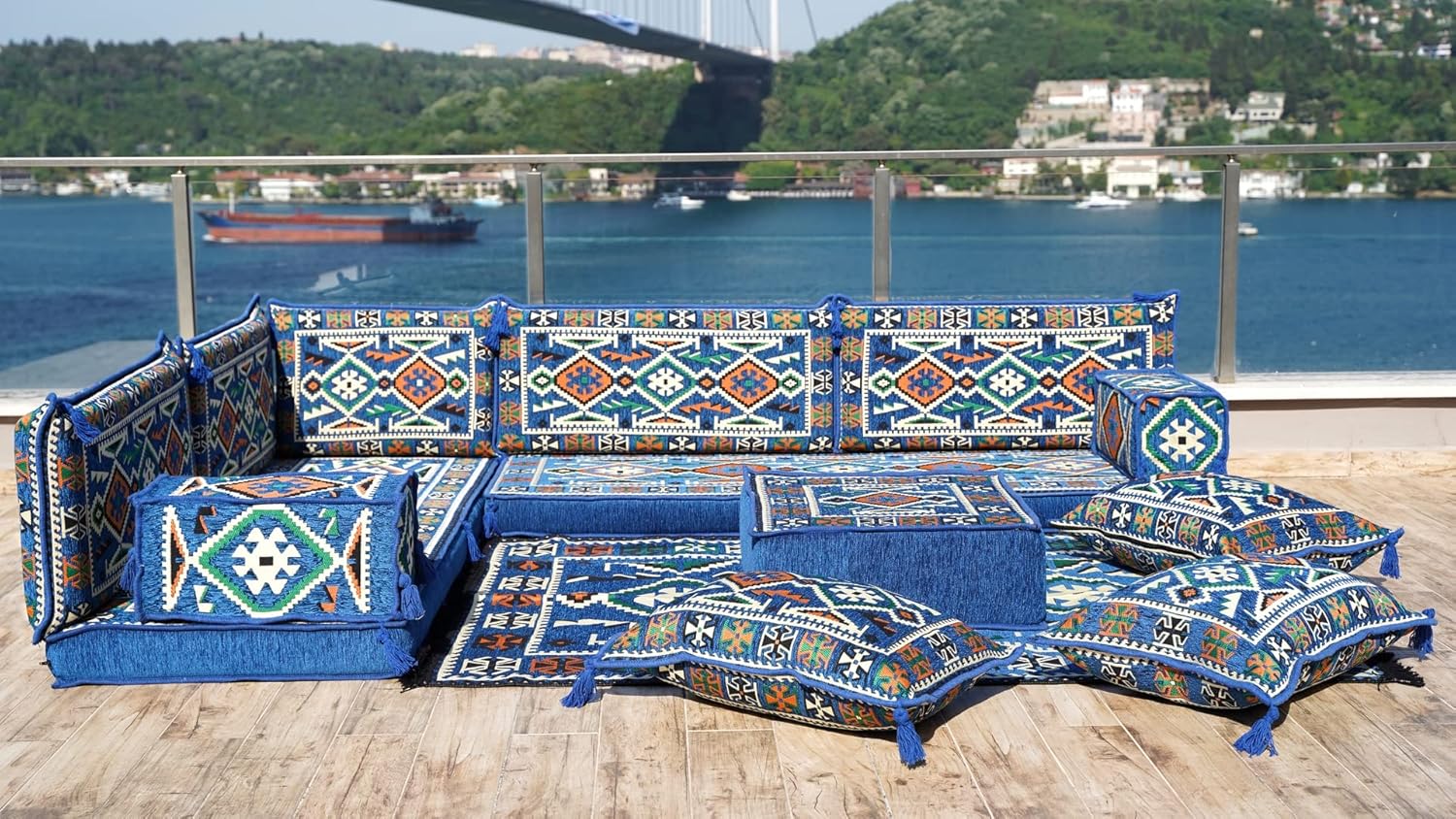 Royal Blue Arabic Floor Sofa Set, Balcony Patio Sofas, Terrace Sofa, Ethnic Sofa, Moroccan Sofas, Sectional Sofas, Hookah Sofas