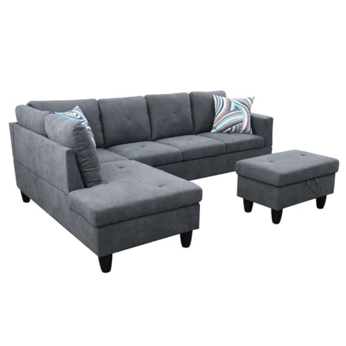 Convertible Sectional Sofa Couch, 3-seat L-Shaped Couch with Ottoman, Couches with Linen Fabric, with Moveable Chaise Ottoman Lounge for Apartment/Upstairs Loft/Living Room, Grey.97in(Right,Bro