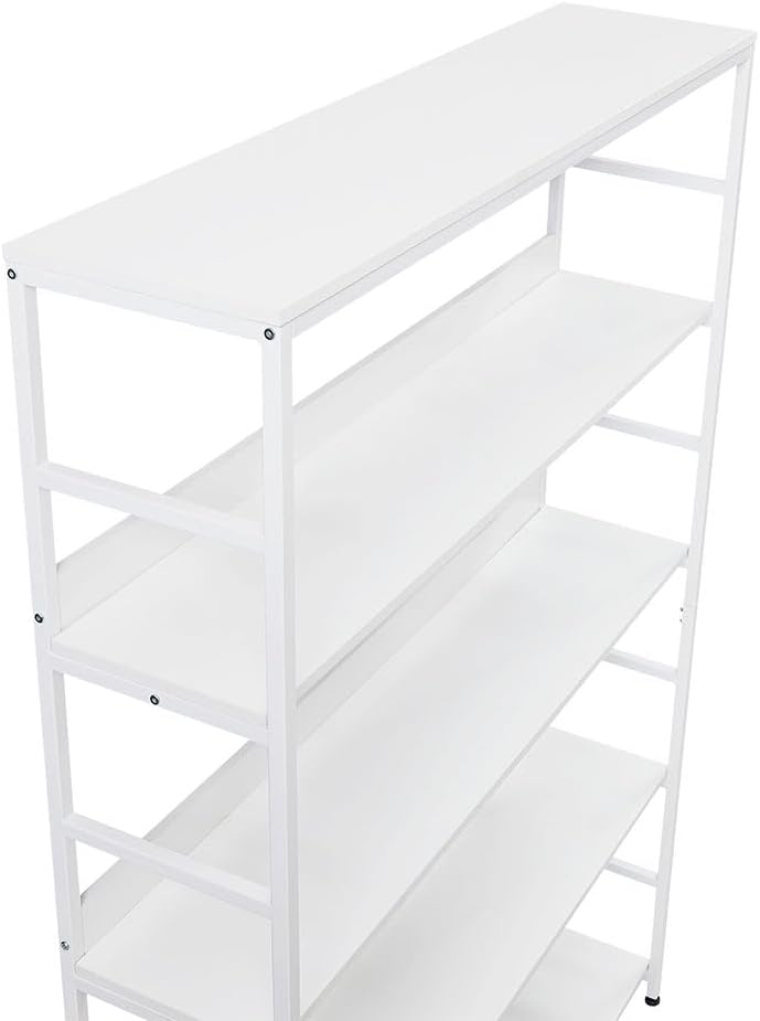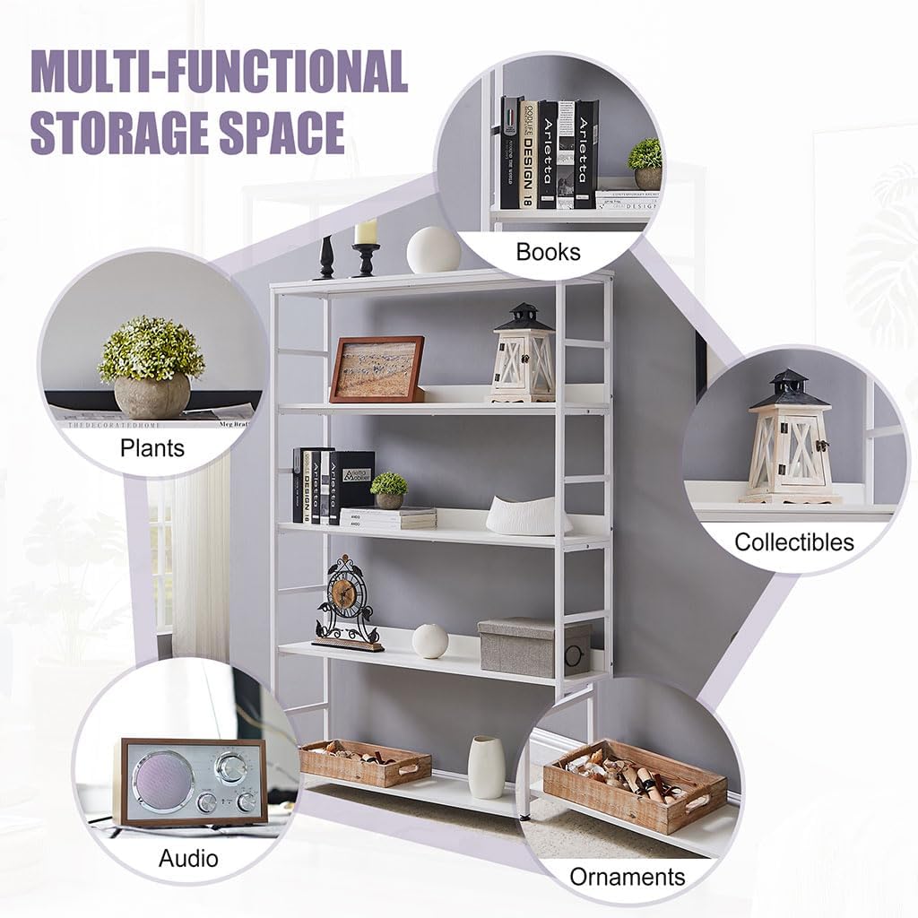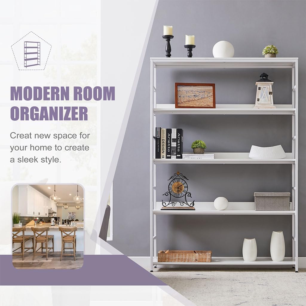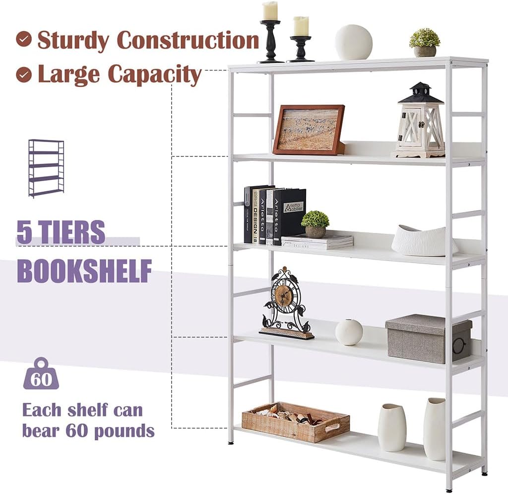 White Bookshelf, 5 Tier Tall Industrial Bookcase with MDF Board and Practical Powder-Coated Steel Frame Wood Metal Frame Standing Book Shelf for Bedroom Living Room Home Office(White)