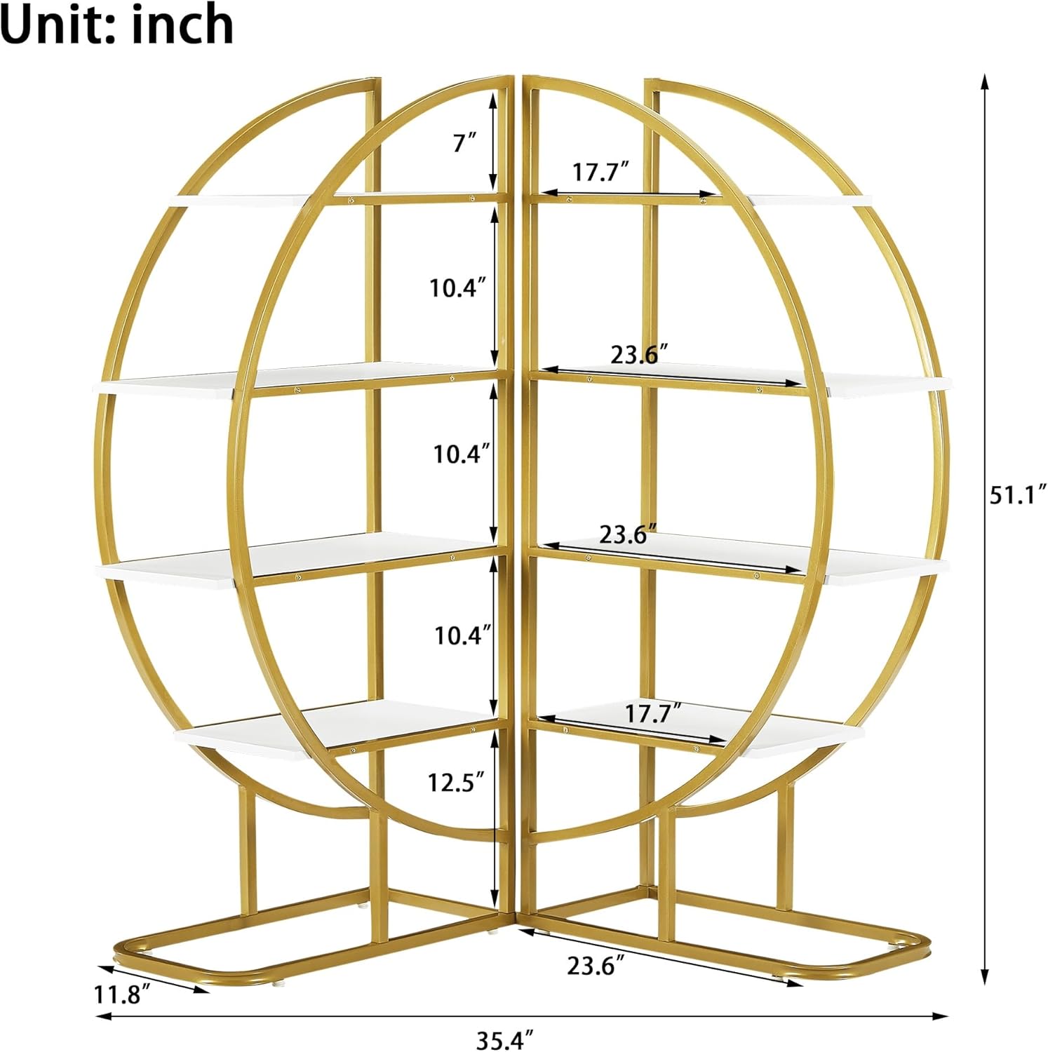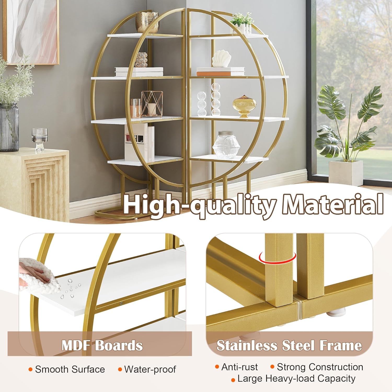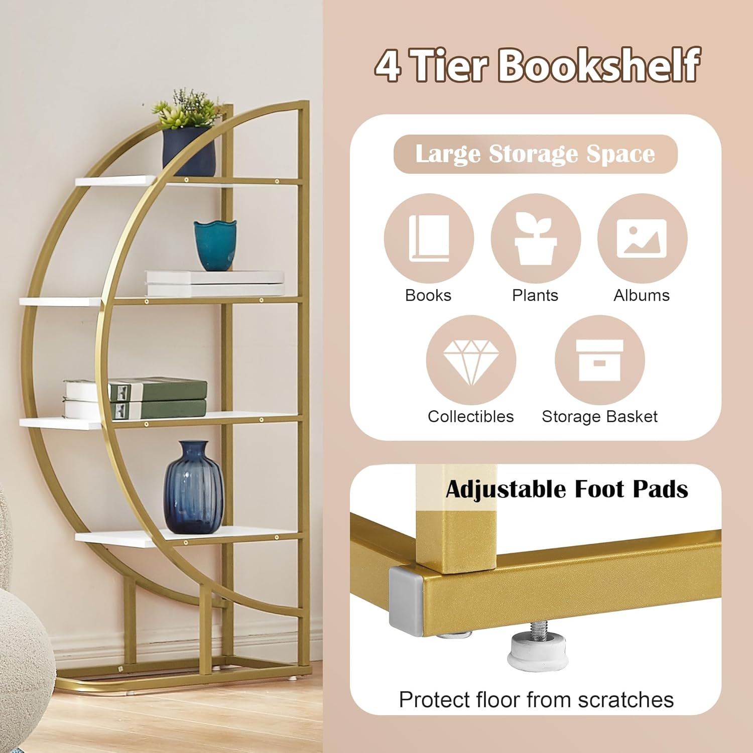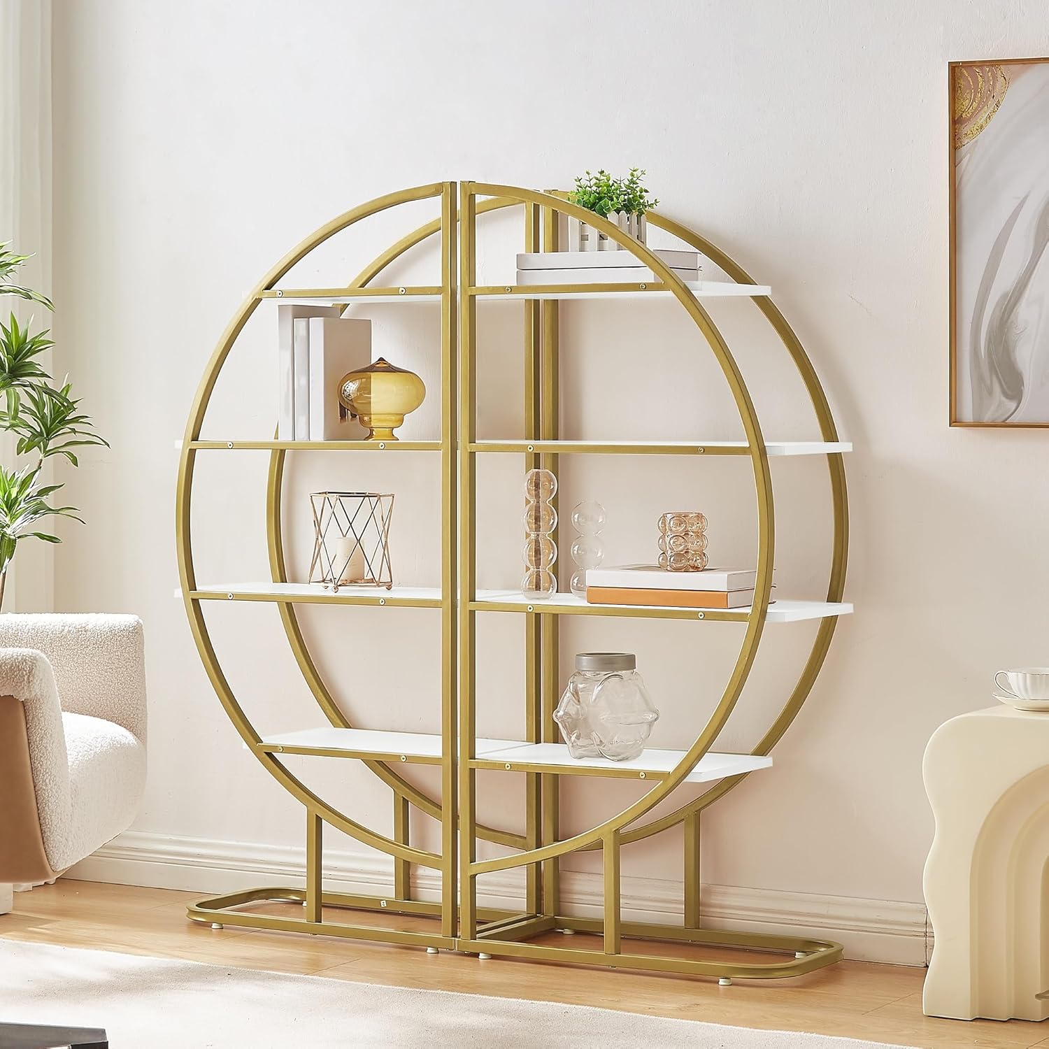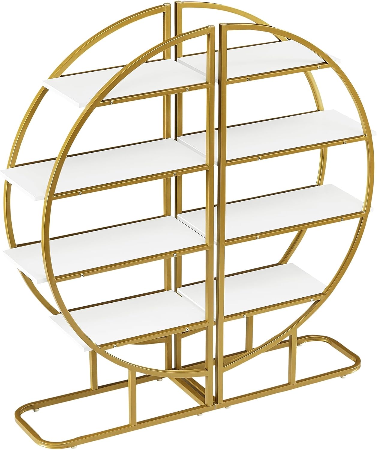 SEALODY 4 Tiers Round Bookshelf, Stainless Steel Frame and MDF Boards, Different Placements Round Bookshelf with Adjustable Foot Pads for Living Room, Home Office, White