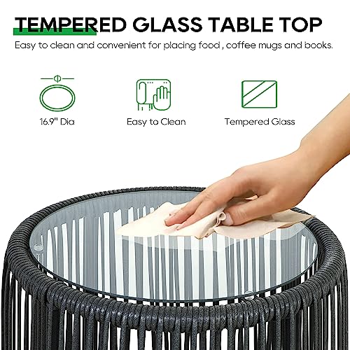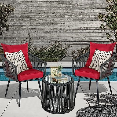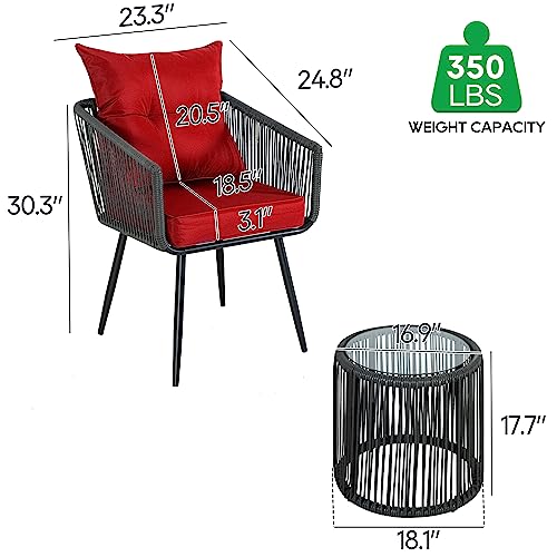 3 Piece Patio Bistro Set, Outdoor Wicker Balcony Furniture, Rope Woven Rattan Table and Chairs Conversation Set of 2 with 3.1” Thick Cushions for Apartments Backyard Porch Deck, Red Cushion