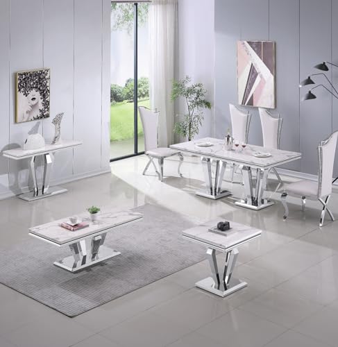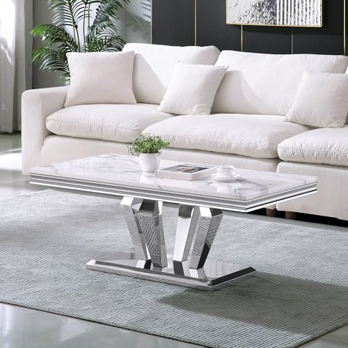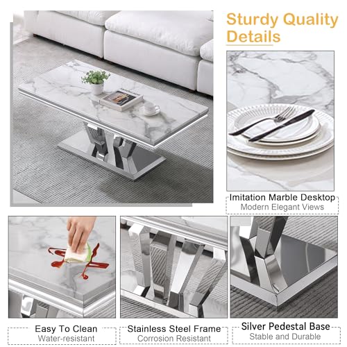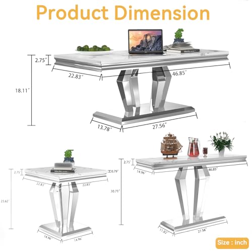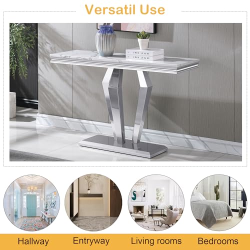 Luxury Marble Console Table Elegant White Faux Marble Sofa Table w/Silver Mirrored Stainless Steel Pedestal Modern 47" Rectangular Console Entryway Hall Table for Living Room Hallway