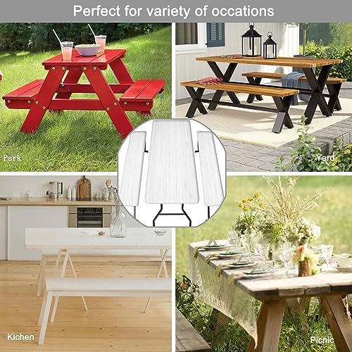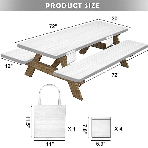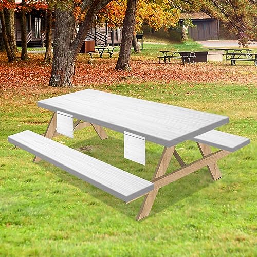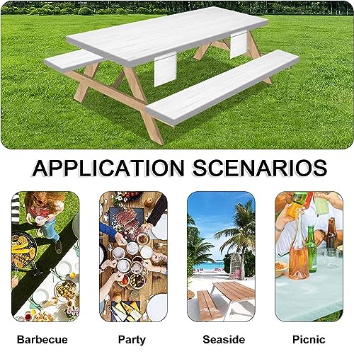 Grey and White 72" Polyester Picnic Table and Bench Fitted Tablecloth, Wooden Planks Horizontal Lines Rustic Timber Soft Tone Oak Background, perfect for party outdoor patio, 28 x 72 Inch White