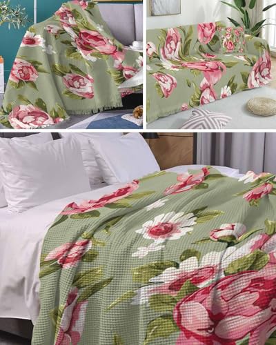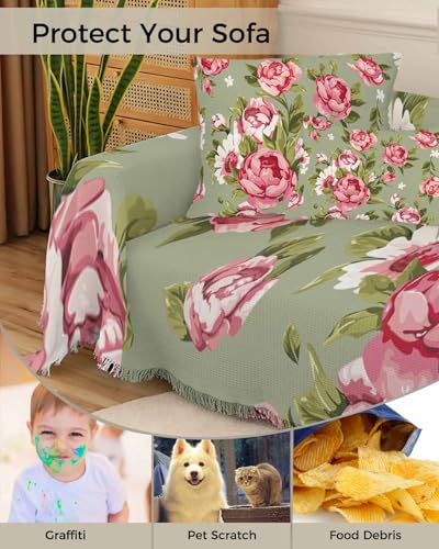 Spring Summer Sofa Cover Couch Covers for 3-4 Cushion Couch Throw Couch Cover with Tassel Soft Sofa Slipcover Watercolor Leaves Floral Rose Red Furniture Protector Couch for Dog Pet 71"x150"