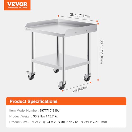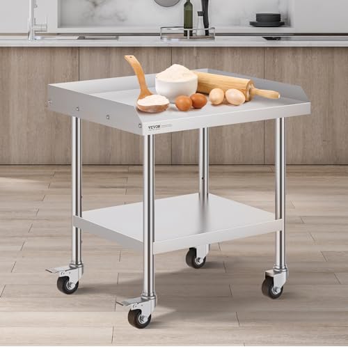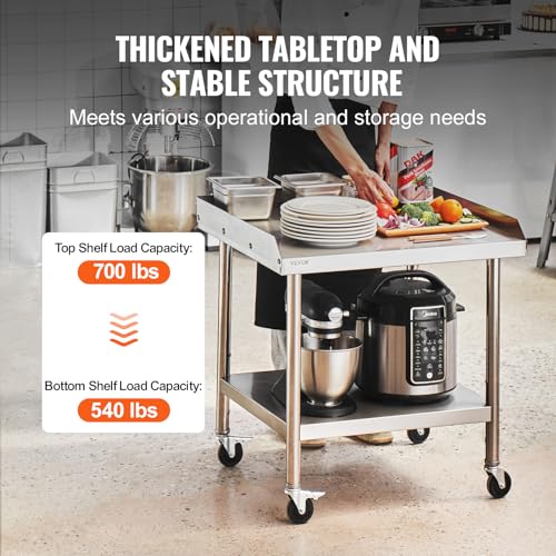 VEVOR Stainless Steel Work Table, 24 x 24 x 30 Inch Commercial Food Prep Worktable with 4 Wheels, Casters, 3-Sided Backsplash Heavy Duty Prep Worktable, Metal Work Table for Restaurant Home Hotel