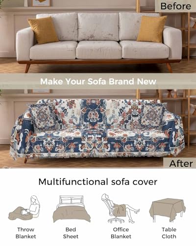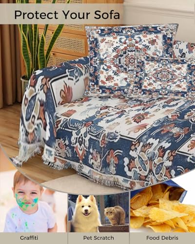 Boho Vintage Sofa Cover Couch Covers for 3-4 Cushion Couch Throw Couch Cover with Tassel Soft Sofa Slipcover Leaf Floral Textured Navy Blue Furniture Protector Couch for Dog Pet 71"x150"