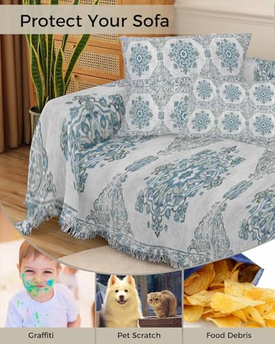 Boho Sofa Cover Couch Covers for 3-4 Cushion Couch Throw Couch Cover with Tassel Soft Sofa Slipcover Vintage Floral Texture Gray Green Furniture Protector Couch for Dog Pet 71"x150"