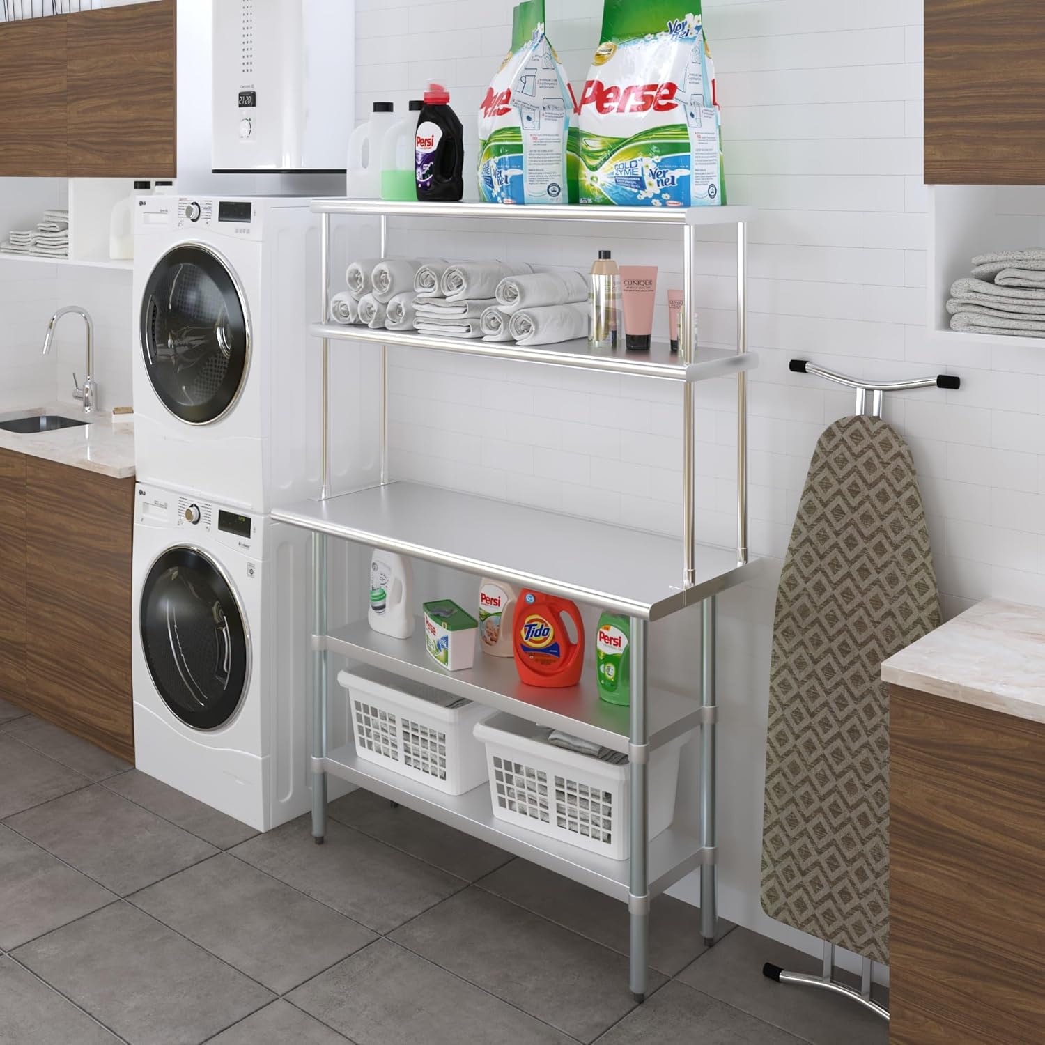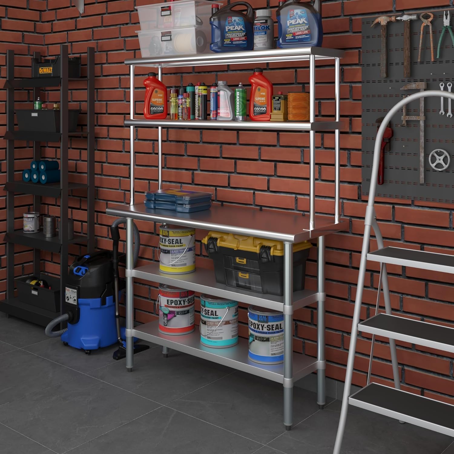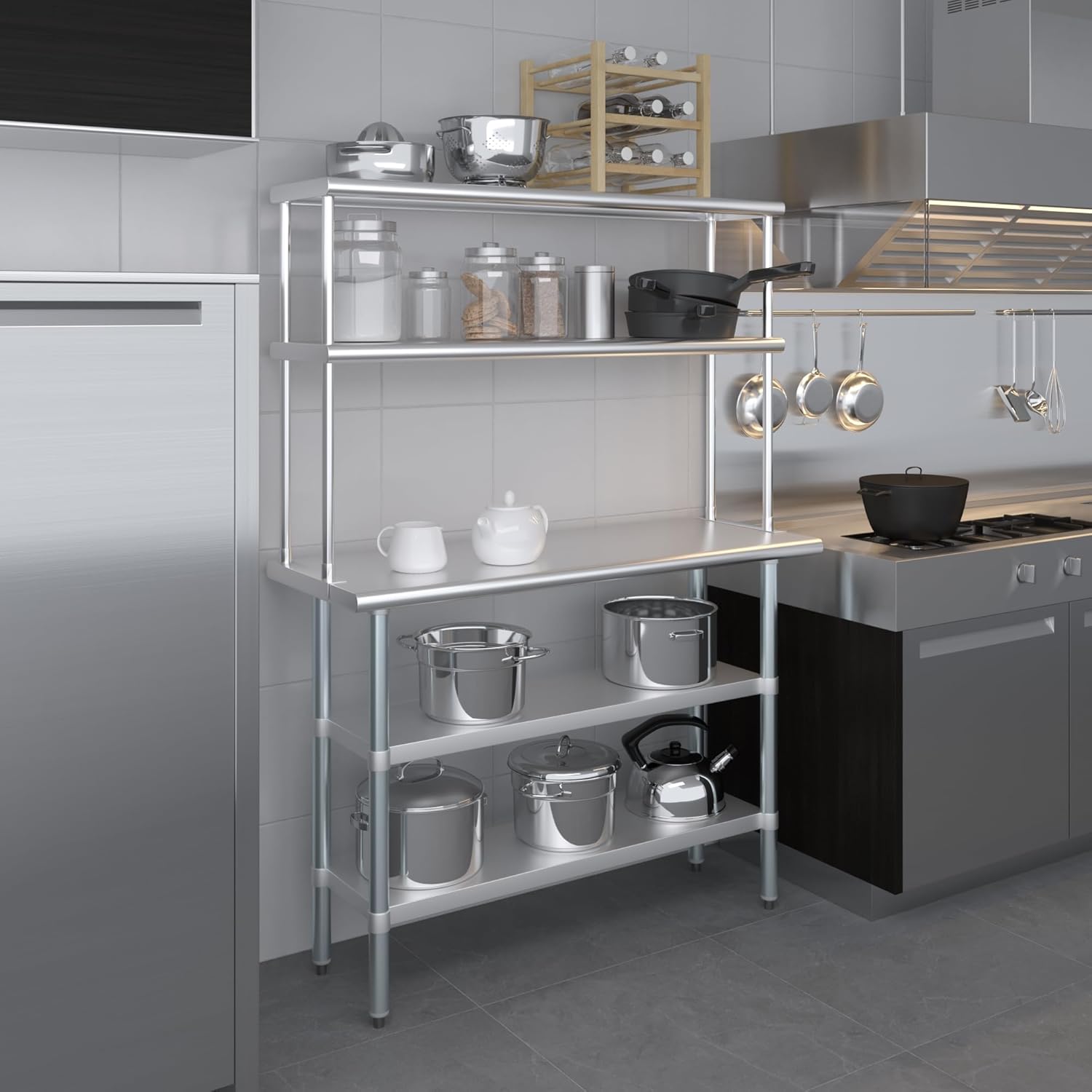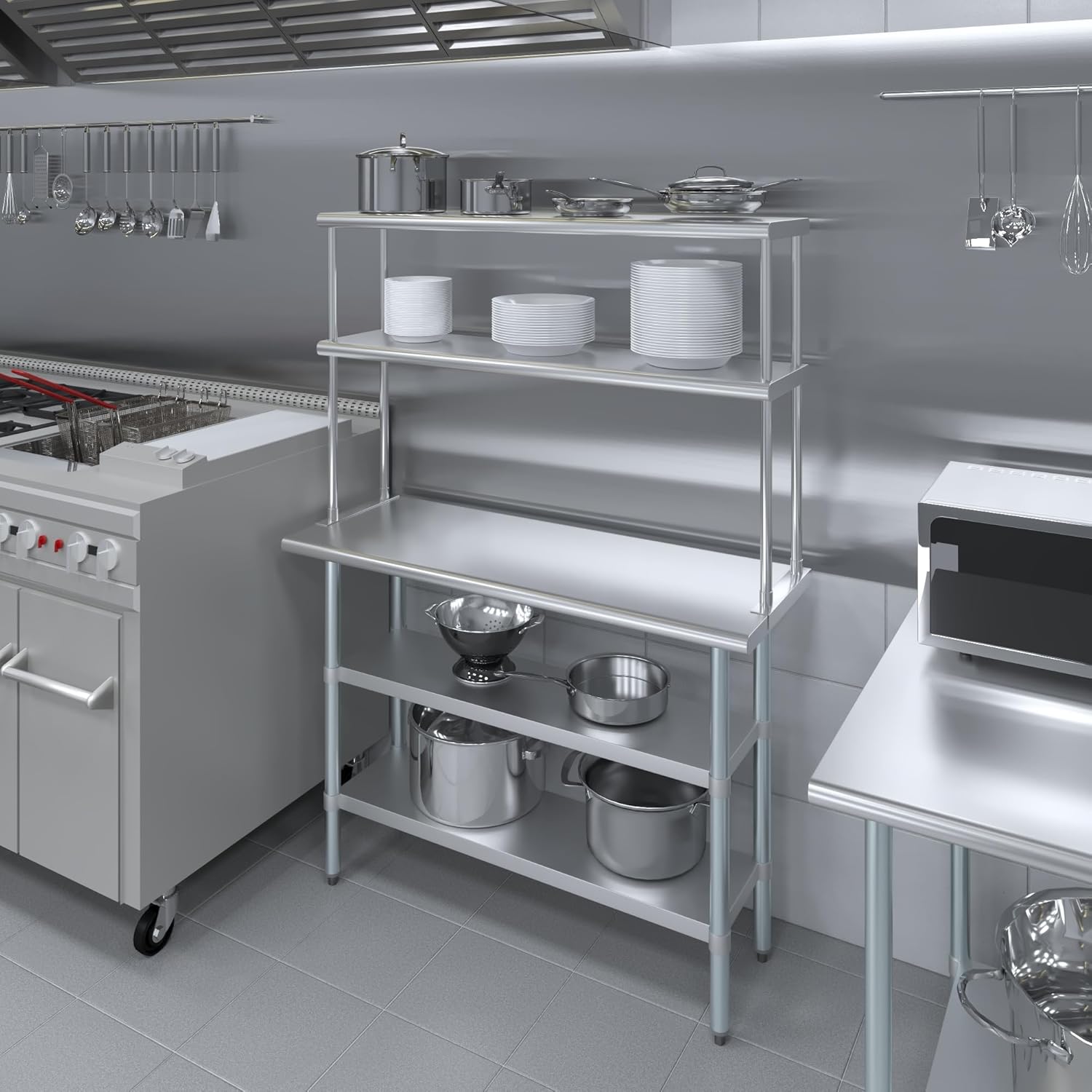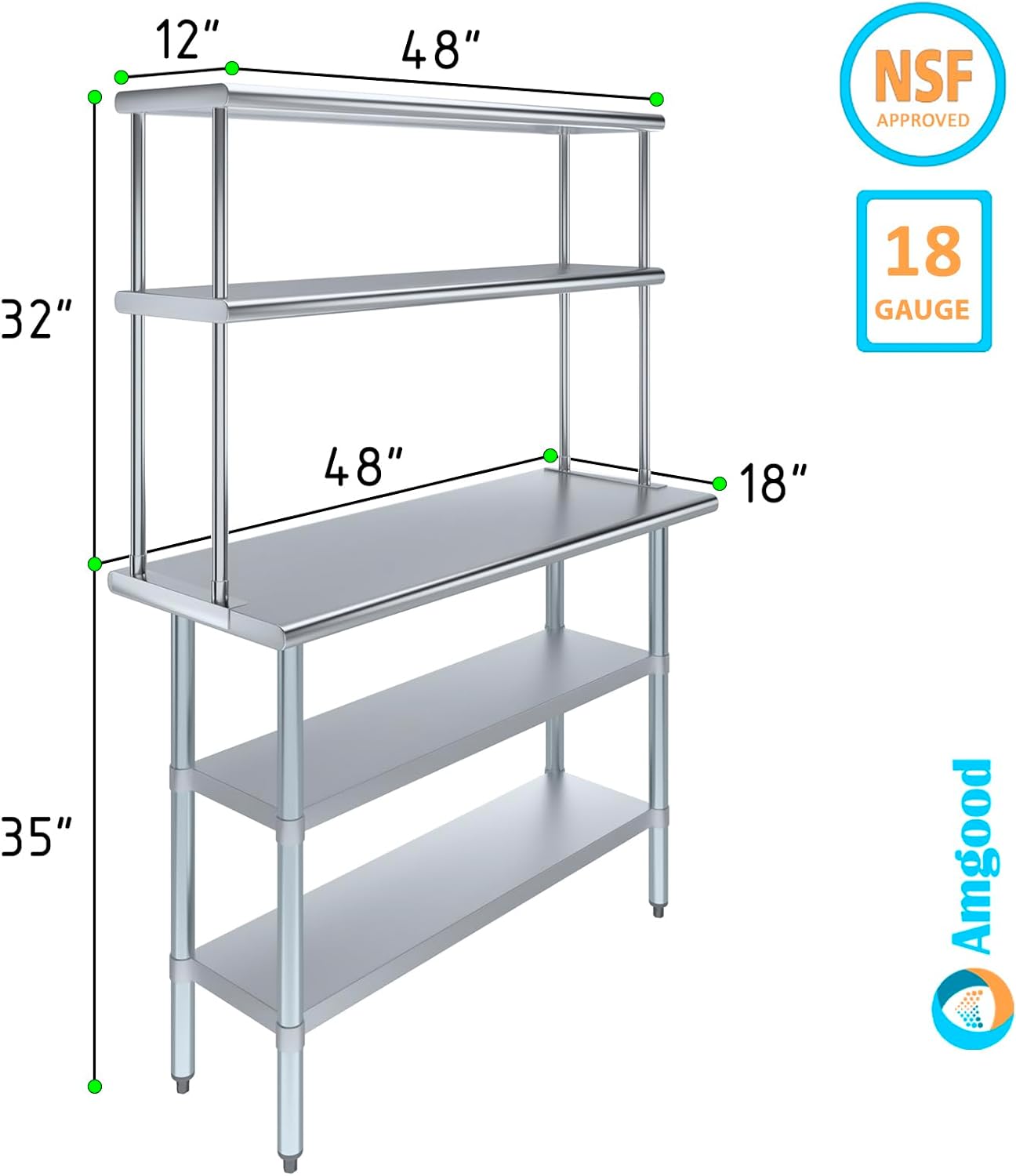 18" x 48" Stainless Steel Work Table with Two Shelves and 12" Wide Double Tier Overshelf | Metal Kitchen Prep Table & Shelving Combo
