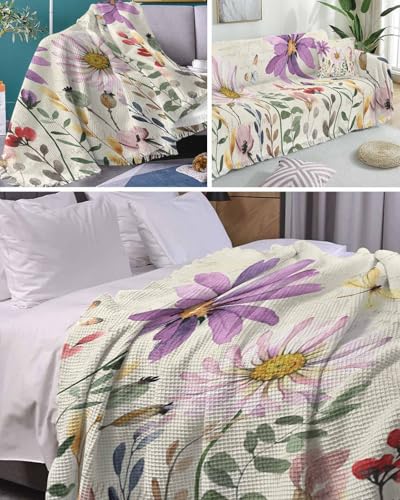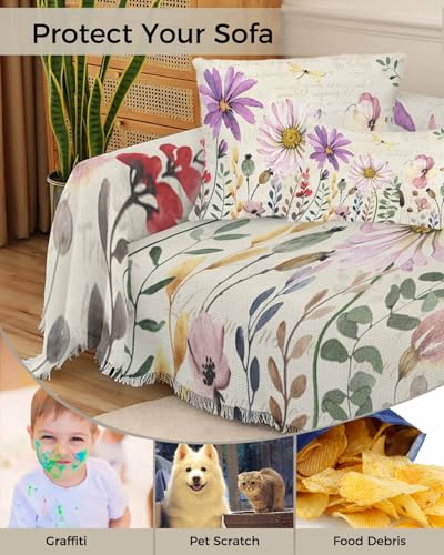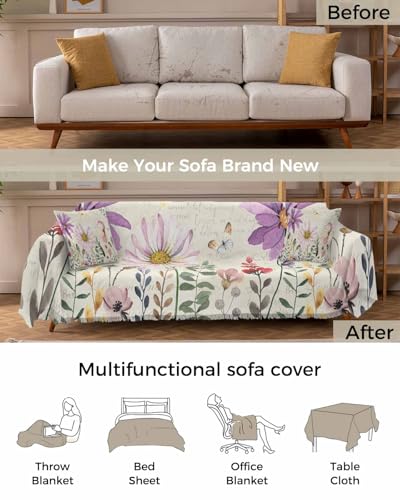 Purple Pink Floral Cover Couch Covers for 3 Cushion Couch Throw Couch Cover with Tassel Soft Slipcover Spring Summer Country Plants Flowers White Couch Furniture Protector for Dog Pet 71"x134"