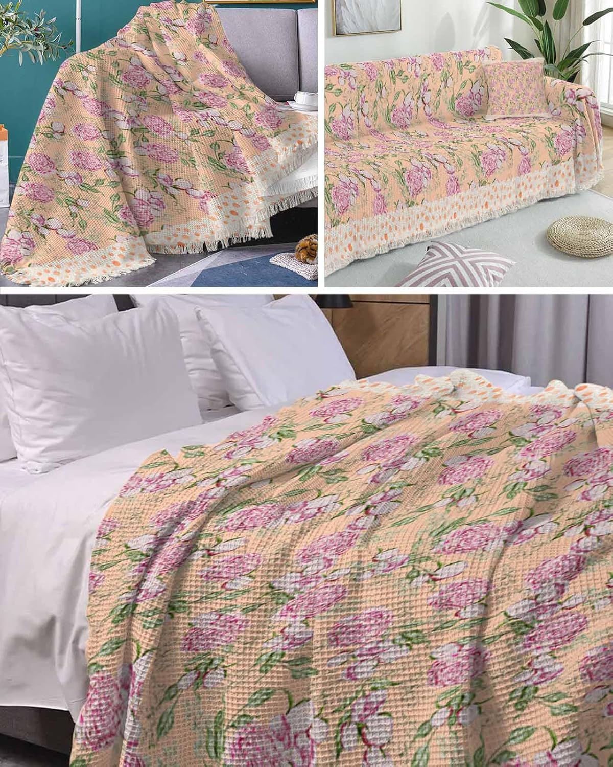 Floral Pink Cover Couch Covers for 3 Cushion Couch Throw Couch Cover with Tassel Soft Slipcover Watercolor Flowers Leaf Dot Texture Orange on Burlap Couch Furniture Protector for Dog Pet 71"x134"