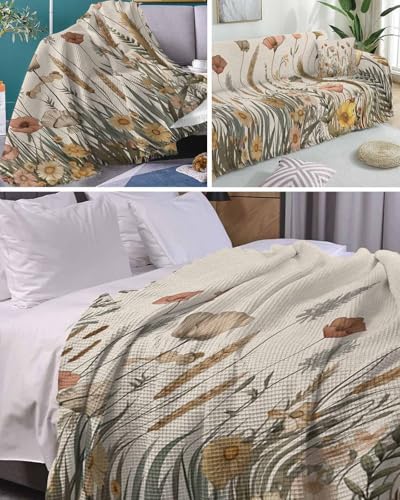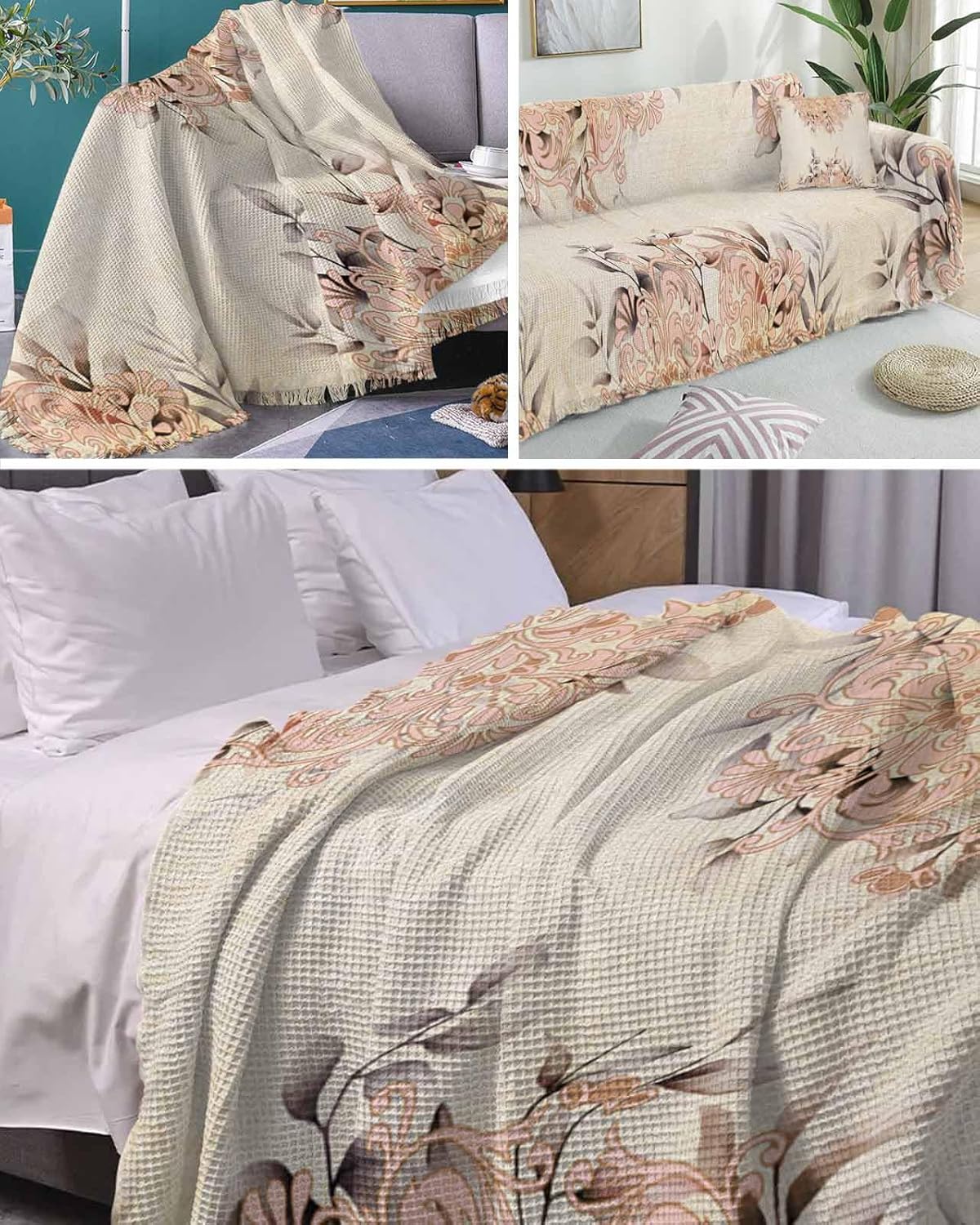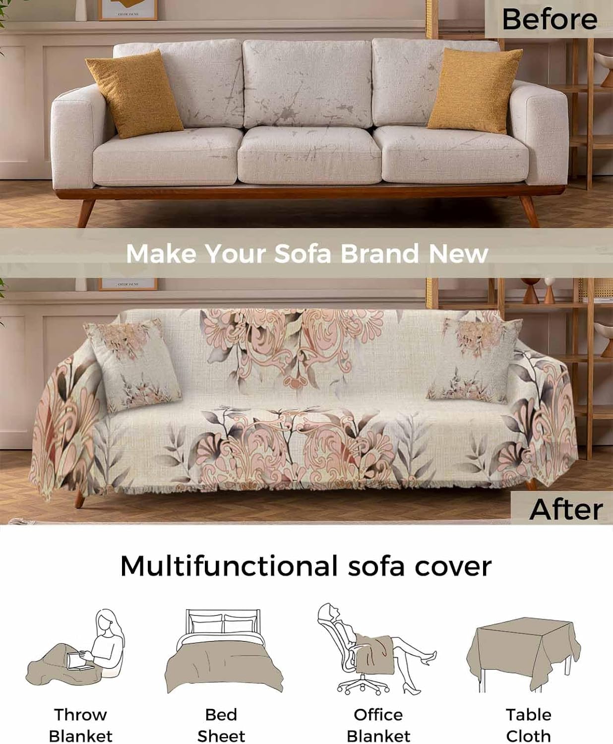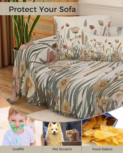 Boho Cover Couch Covers for 3-4 Cushion Couch Throw Couch Cover with Tassel Soft Slipcover Vintage Floral Texture Watercolor Leaves on Burlap Beige Couch Furniture Protector for Dog Pet 71"x150"