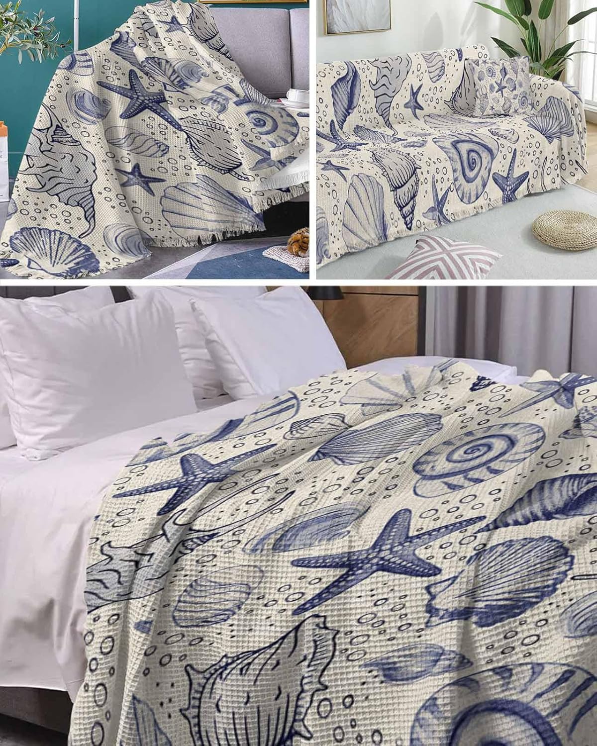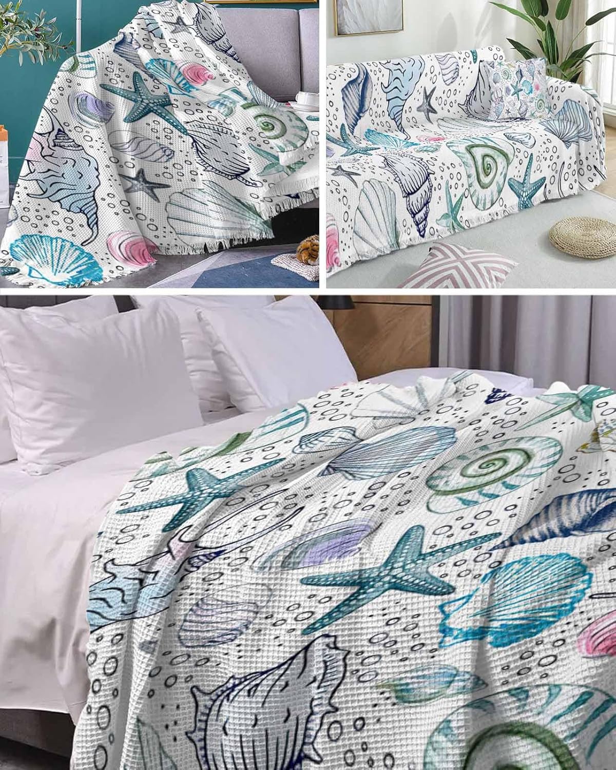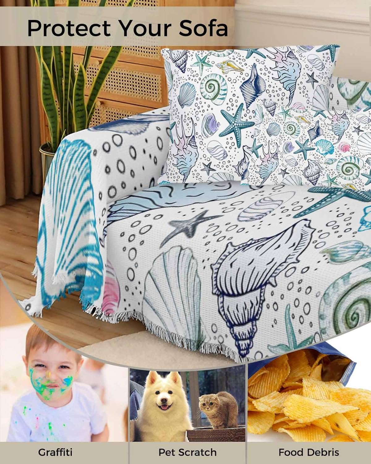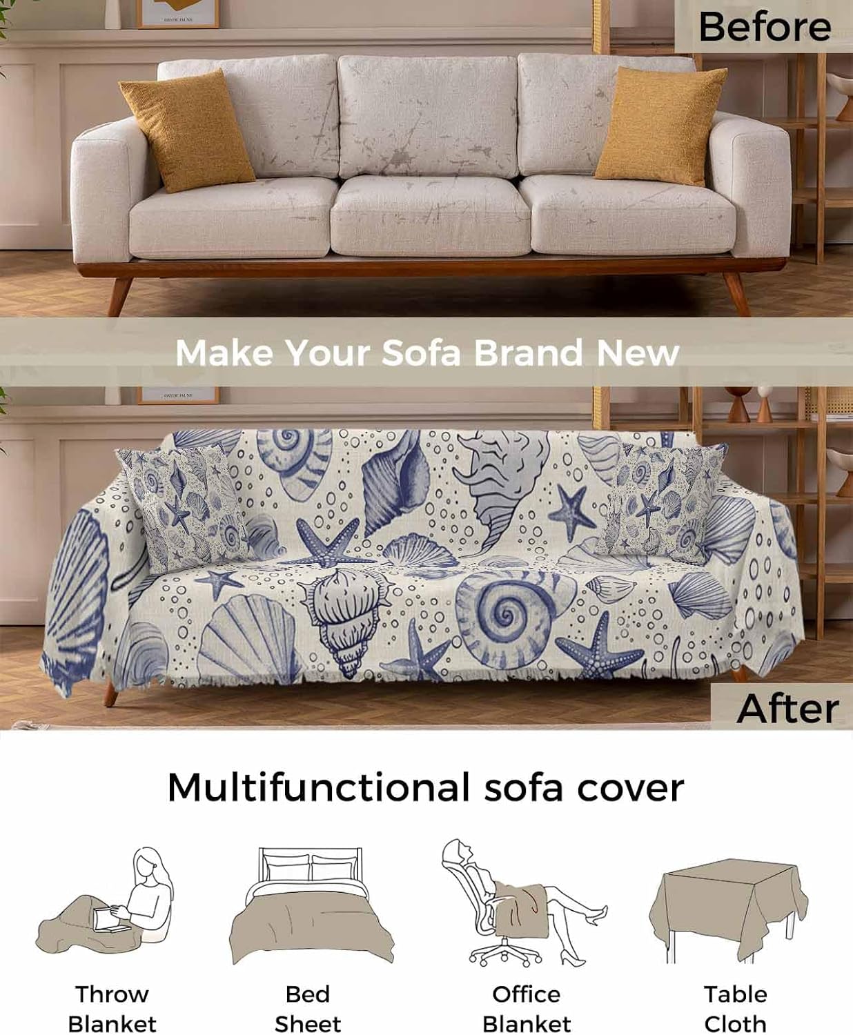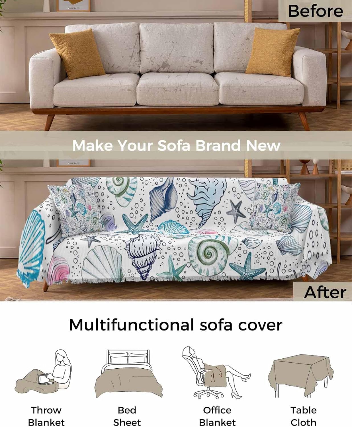 Ocean Sofa Cover Couch Covers for 3 Cushion Couch Throw Couch Cover with Tassel Soft Sofa Slipcover Summer Coastal Green Starfish Conch White Couch Furniture Protector for Dog Pet 71"x134"