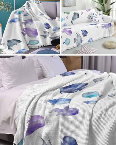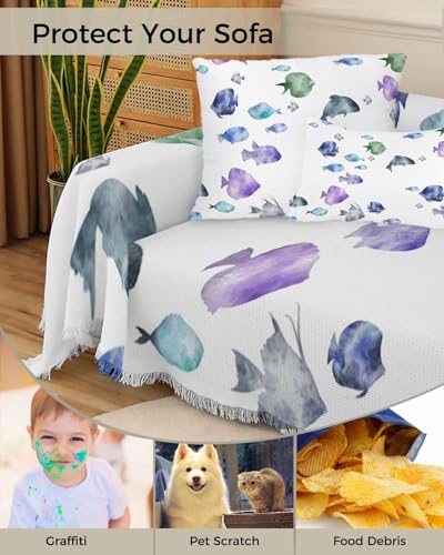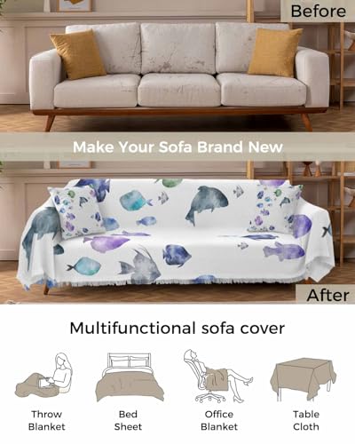 Ocean Colorful Fish Cover Couch Covers for 3 Cushion Couch Throw Couch Cover Tassel Soft Slipcover Summer Abstract Blue Purple Green Gray Fish on Burlap Couch Furniture Protector for Dog Pet 71"x134"