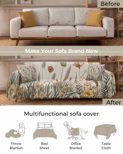 Fall Sofa Cover Couch Covers for 3 Cushion Couch Throw Couch Cover with Tassel Soft Sofa Slipcover Autumn Floral Flowers Plants Beige Couch Furniture Protector for Dog Pet 71"x134"
