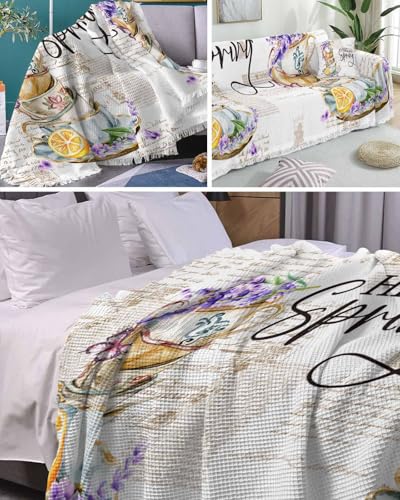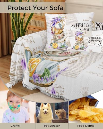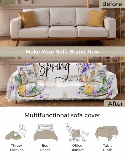 Lavender Purple Sofa Cover Couch Covers for 3 Cushion Couch Throw Couch Cover with Tassel Soft Sofa Slipcover Vintage Spring Watercolor Cup Flowers Lemon Couch Furniture Protector for Dog Pet 71"x134"