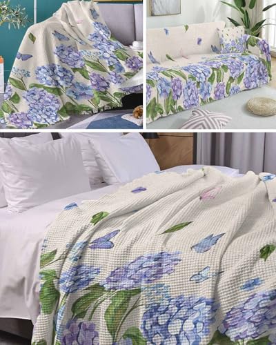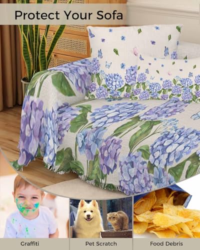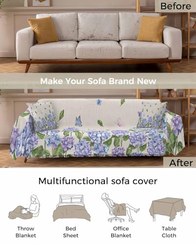 Floral Blue Cover Couch Covers for 3-4 Cushion Couch Throw Couch Cover with Tassel Soft Slipcover Summer Country Hydrangea Flowers on Burlap White Couch Furniture Protector for Dog Pet 71"x150"