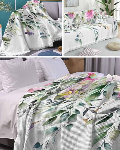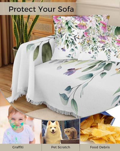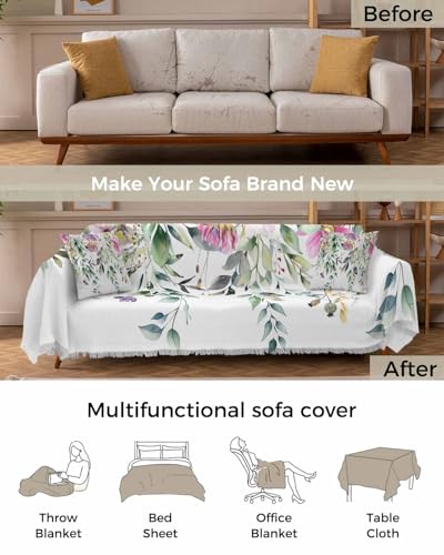 Eucalyptus Leaves Green Cover Couch Covers for 3 Cushion Couch Throw Couch Cover with Tassel Soft Slipcover Pastoral Style Purple Pink Flowers White Couch Furniture Protector for Dog Pet 71"x134"