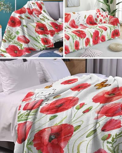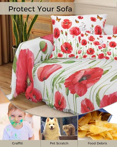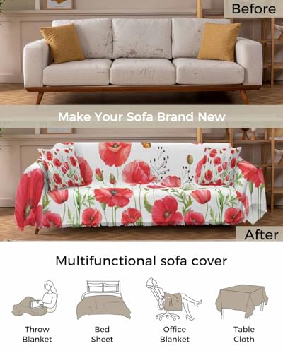 Poppy Floral Red Sofa Cover Couch Covers for 3 Cushion Couch Throw Couch Cover with Tassel Soft Sofa Slipcover Vintage Watercolor Butterfly Leaves White Couch Furniture Protector for Dog Pet 71"x134"
