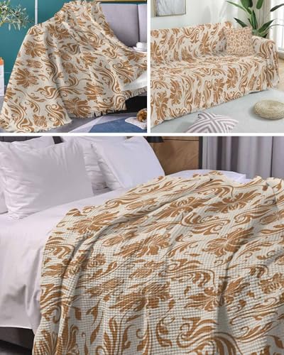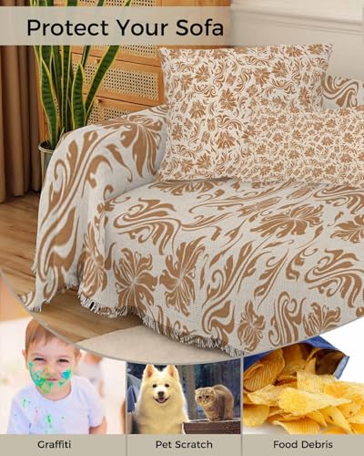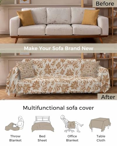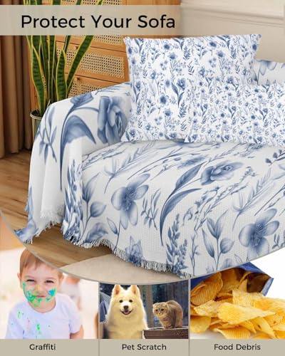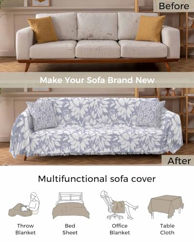 Abstract Floral Blue Sofa Cover Couch Covers for 3 Cushion Couch Throw Couch Cover with Tassel Soft Sofa Slipcover Vintage Flowers Textured Beige Couch Furniture Protector for Dog Pet 71"x134"