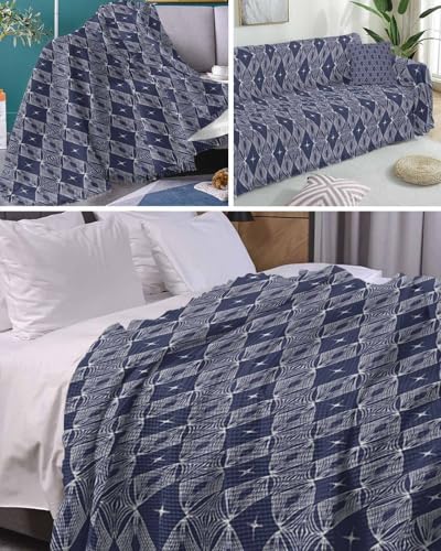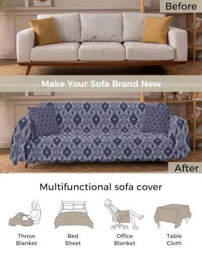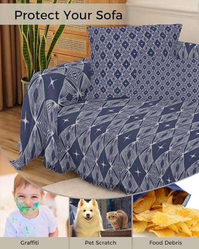 Modern Geometric Blue Sofa Cover Couch Covers for 3 Cushion Couch Throw Couch Cover with Tassel Soft Sofa Slipcover Abstract Rhombic Couch Furniture Protector for Dog Pet 71"x134"