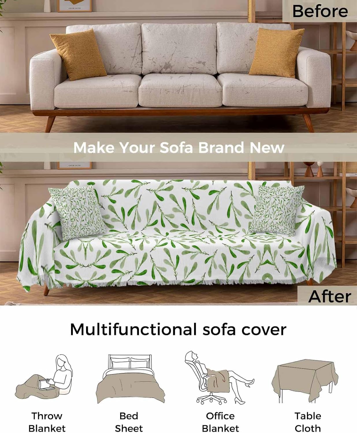 Leaf Green Sofa Cover Couch Covers for 3 Cushion Couch Throw Couch Cover with Tassel Soft Sofa Slipcover Abstract Leaf Plants Texture White Couch Furniture Protector for Dog Pet 71"x134"