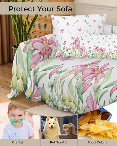 Spring Floral Cover Couch Covers for 3 Cushion Couch Throw Couch Cover with Tassel Soft Slipcover Watercolor Butterfly Pink Flowers Green Leaves White Couch Furniture Protector for Dog Pet 71"x134"