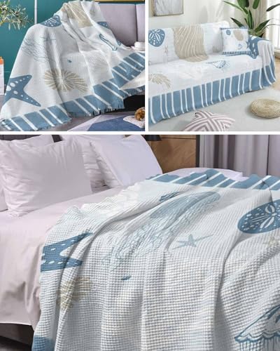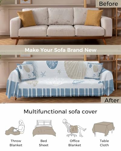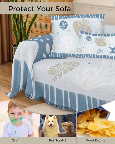 Ocean Navy Blue Cover Couch Covers for 3-4 Cushion Couch Throw Couch Cover with Tassel Soft Slipcover Vintage Jellyfish Starfish Coral Blue Striped Couch Furniture Protector for Dog Pet 71"x150"
