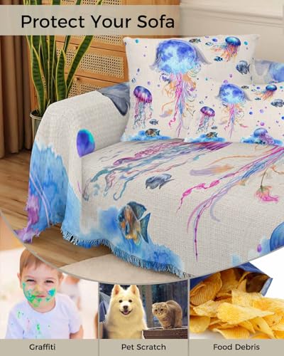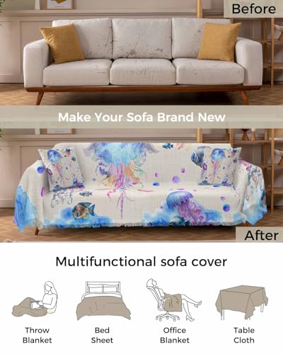 Jellyfish Blue Sofa Cover Couch Covers for 3 Cushion Couch Throw Couch Cover with Tassel Soft Sofa Slipcover Summer Ocean Watercolor Fish White Couch Furniture Protector for Dog Pet 71"x134"