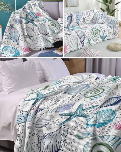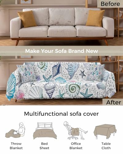 Ocean Sofa Cover Couch Covers for 3 Cushion Couch Throw Couch Cover with Tassel Soft Sofa Slipcover Summer Coastal Green Starfish Conch Wood Grain Couch Furniture Protector for Dog Pet 71"x134"