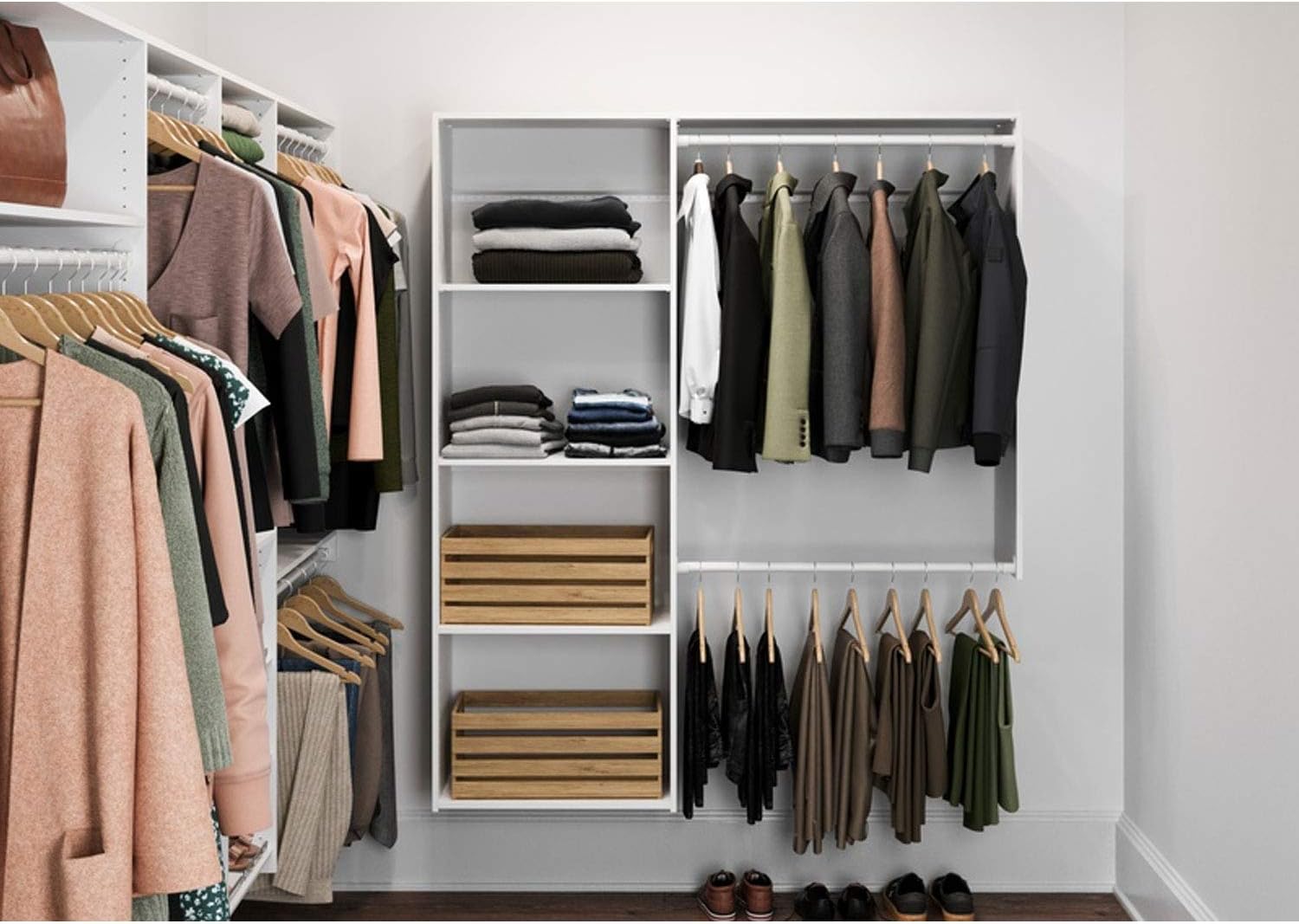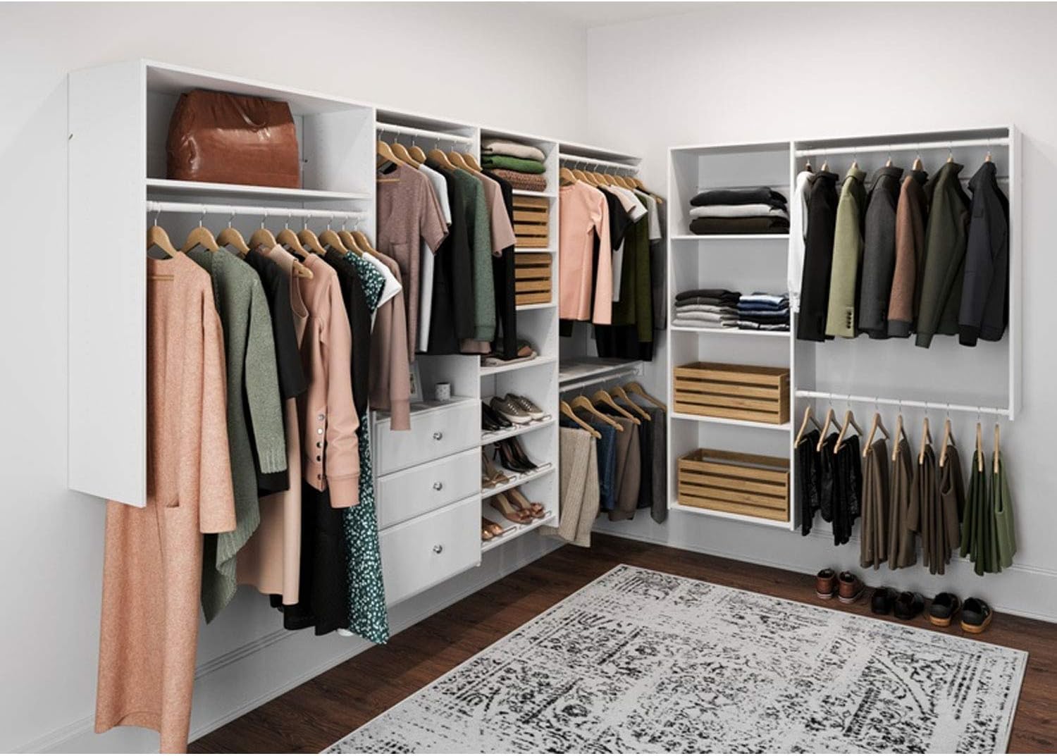 Easy Track PH60-WH L Shaped Walk In Closet Storage Wall Mounted Wardrobe Organizer Kit System with Shelves & Drawers for Bedroom in White w/ Hardware