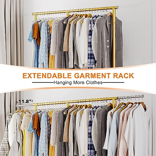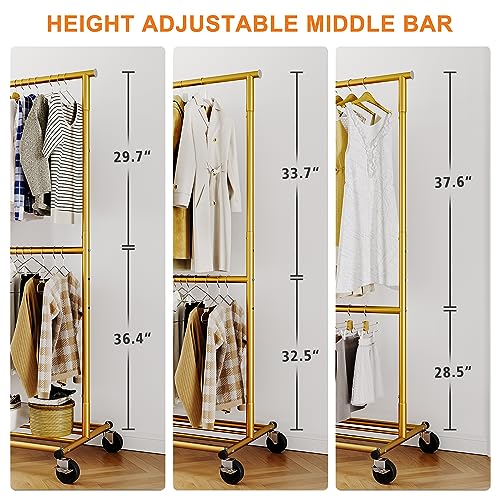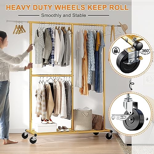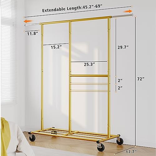 Raybee Gold Clothing Rack for Hanging Clothes, Rolling Heavy Duty Clothes Rack with Wheels for Walk-in Closet, Bed Room, Laundry Room 17.7" D x 69.1" W x 71.9" H, Gold