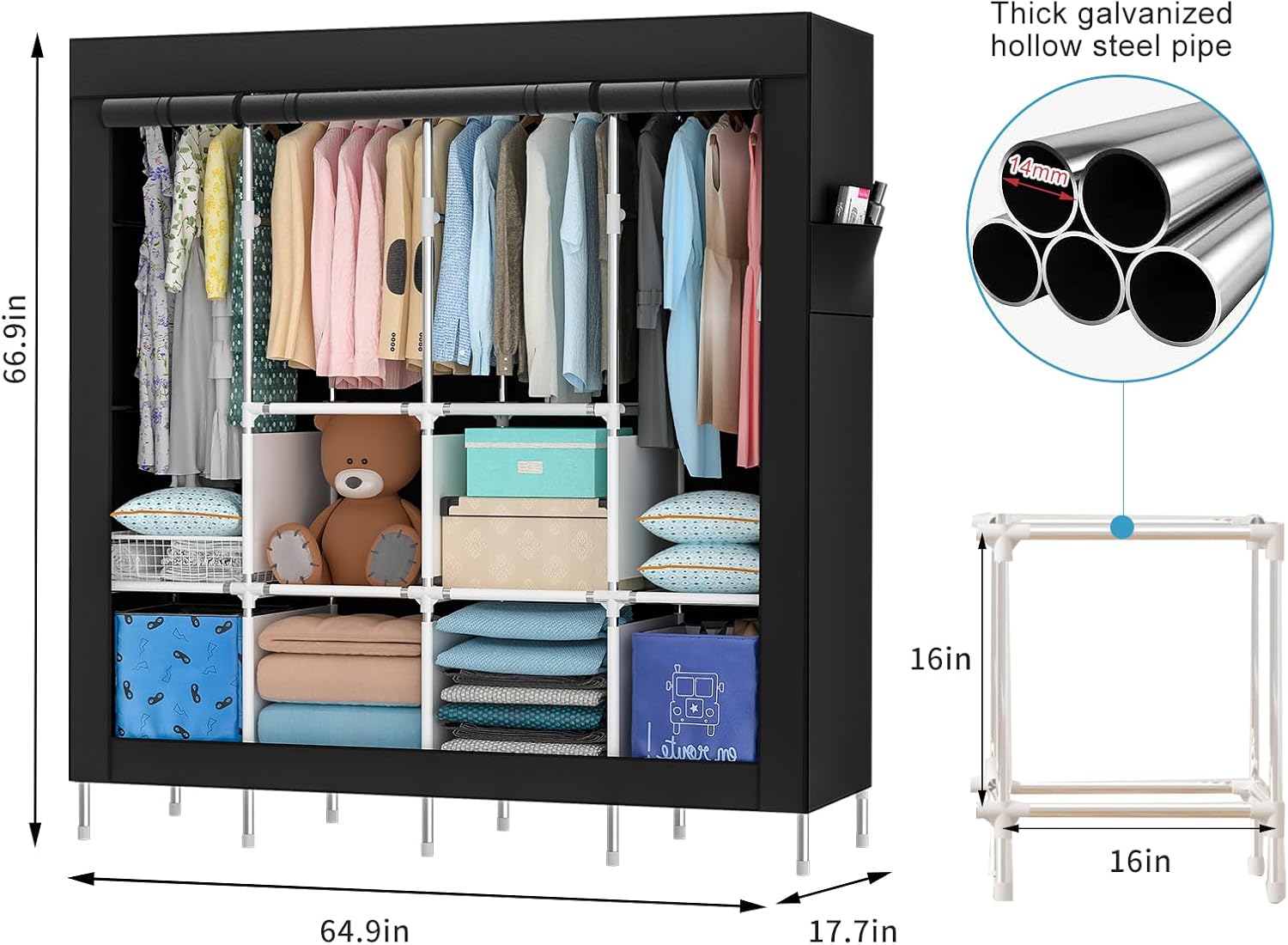 Portable Wardrobe, 67 Inch Closet for Hanging Clothes, Metal Clothing Rack Organizer, Free Standing Wardrobe with Black Oxford Fabric Cover, 67" WX65 HX17.7 D (Dark, King-Size)