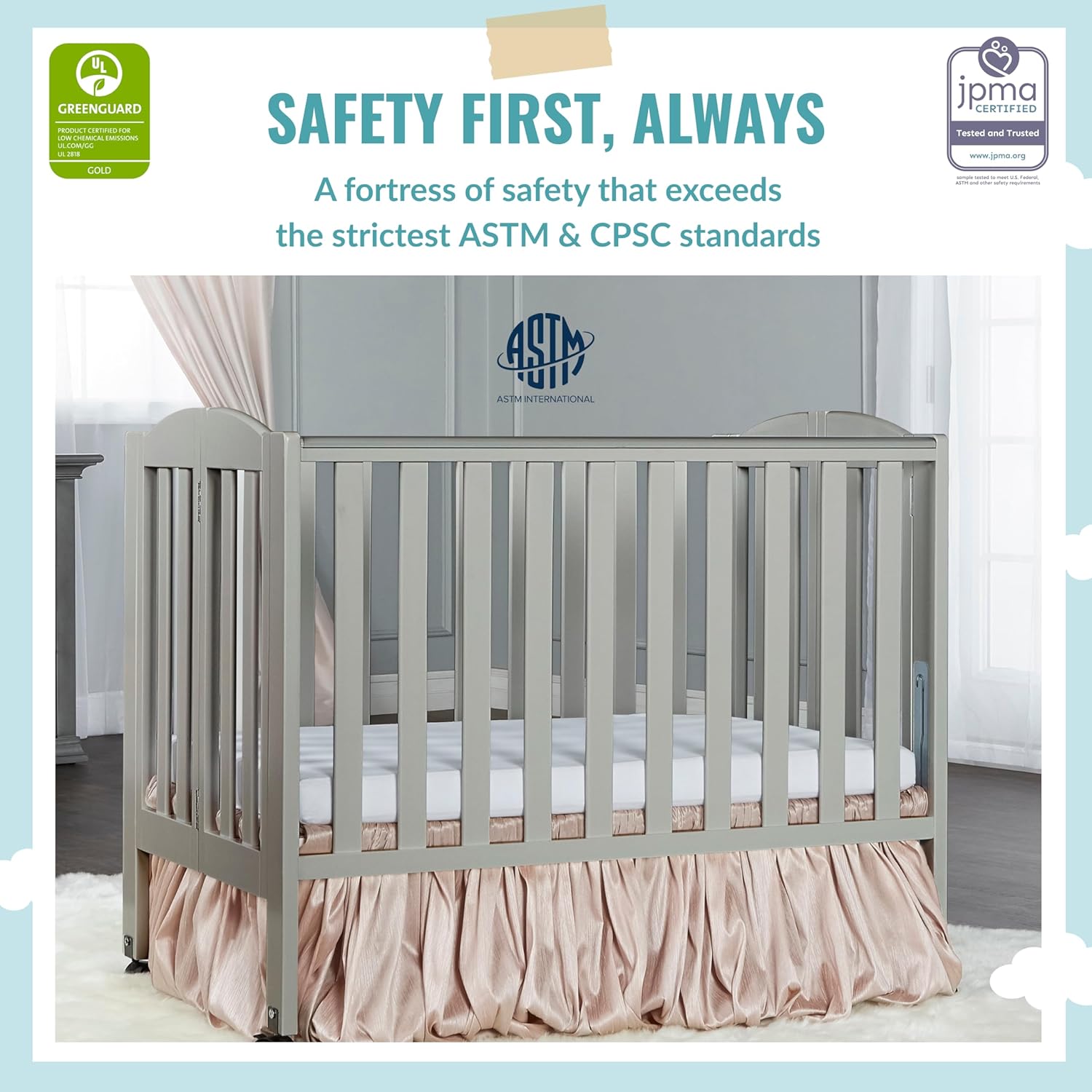 2 in 1 Folding Portable Crib in Cool Grey with Sunset 3” Extra Firm Fiber Crib Mattress, 40x26x38 Inch