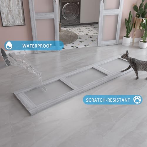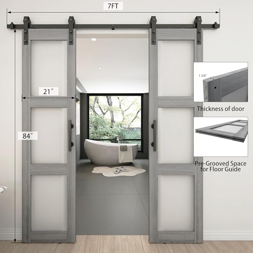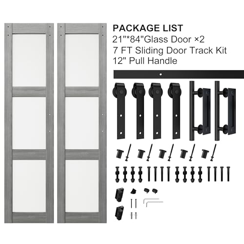 BARNSMITH 21x84in Double Glass Barn Door with 7FT Brushed Nickle Sliding Door Hardware Kit Included & Handle,3-Panel Frosted Glass Solid Wood Water-Proof PVC Surface,Pre-Drilled Easy Assembly,White