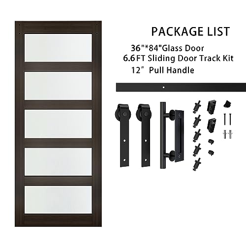 BARNSMITH 36in x 84in Glass Barn Door with 6.6FT Brushed Nickle Sliding Door Hardware Kit included & Handle,5-Panel Frosted Glass Solid Wood Water-Proof PVC Surface,Pre-Drilled Easy Assembly,White