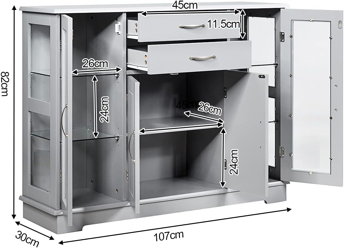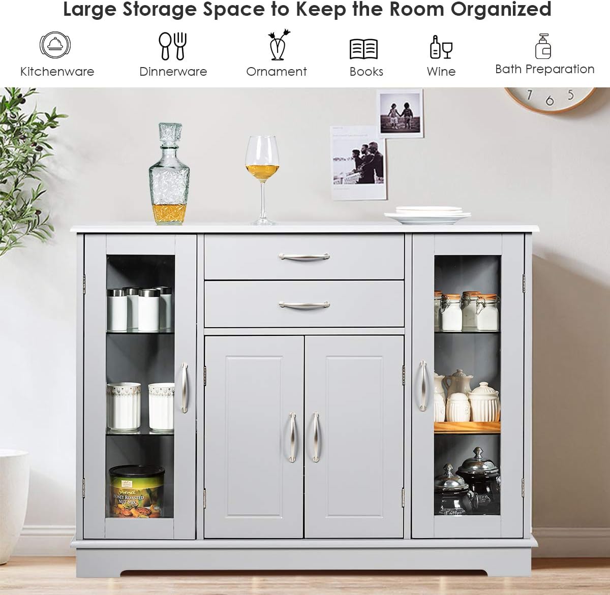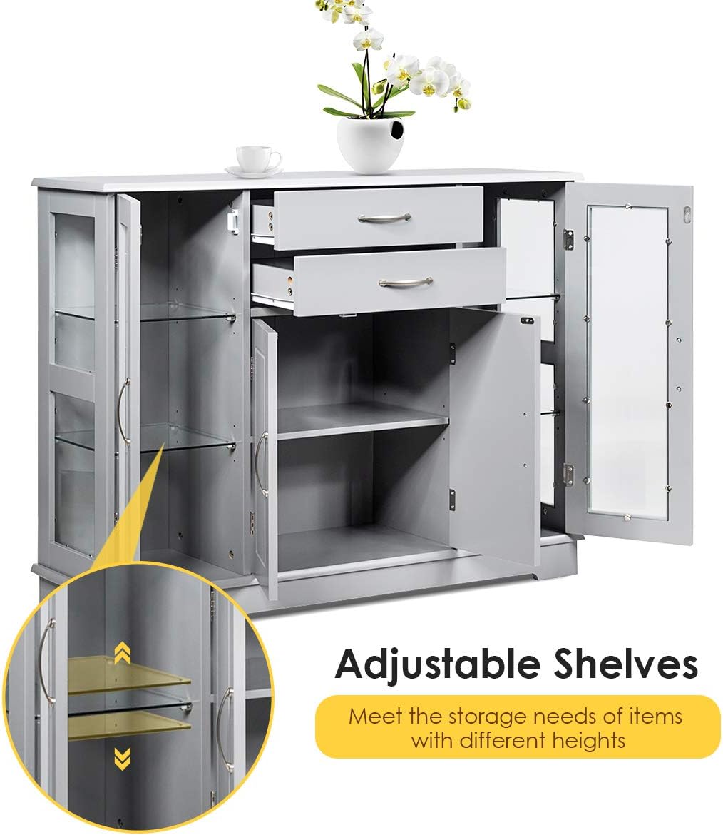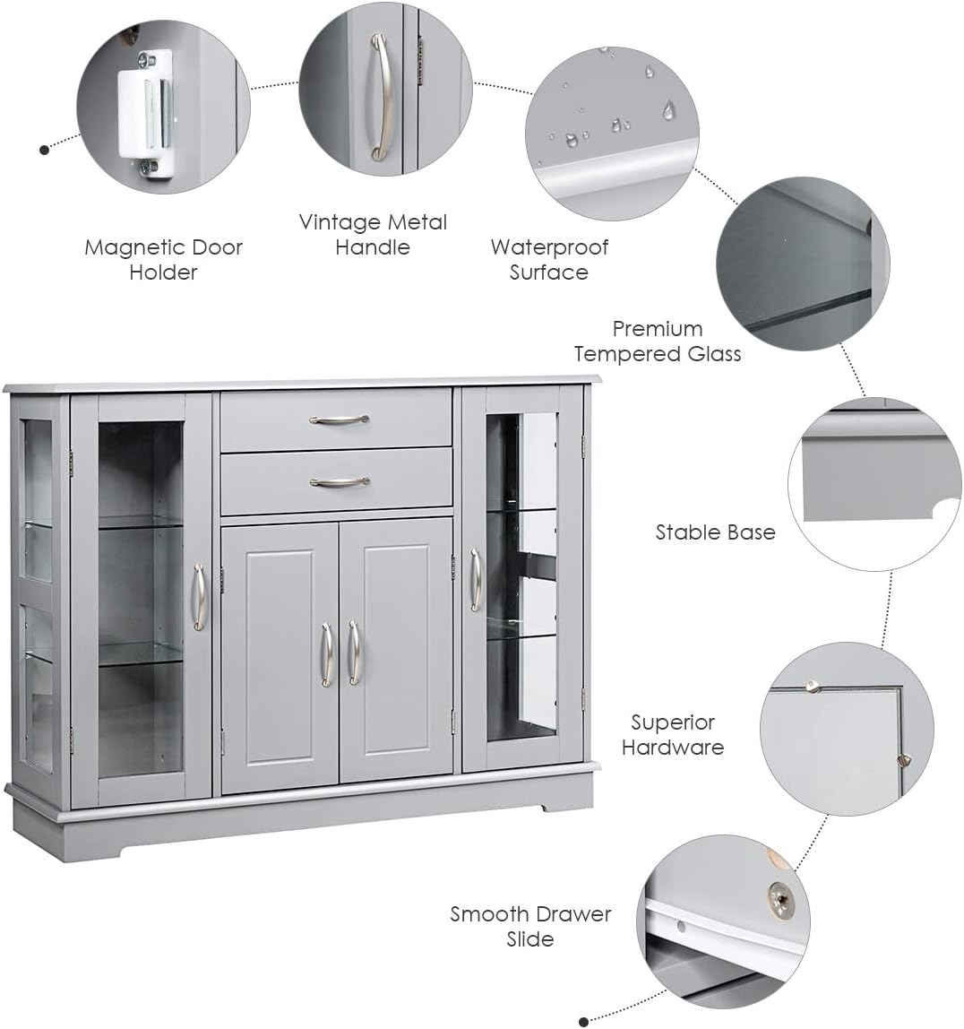 Buffet Cabinet, Sideboard Buffet Cabinet w/3-Position Adjustable Shelf, Kitchen Cupboard w/2 Glass Door & 2 Drawers, Accent Console Table for Kitchen Dining Room Storage Cabinet (Gray)