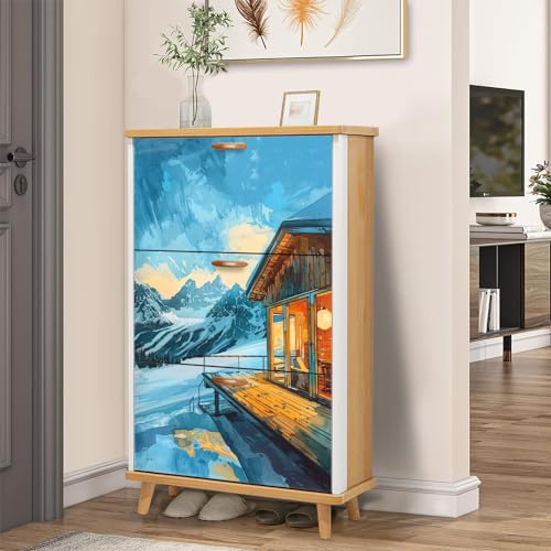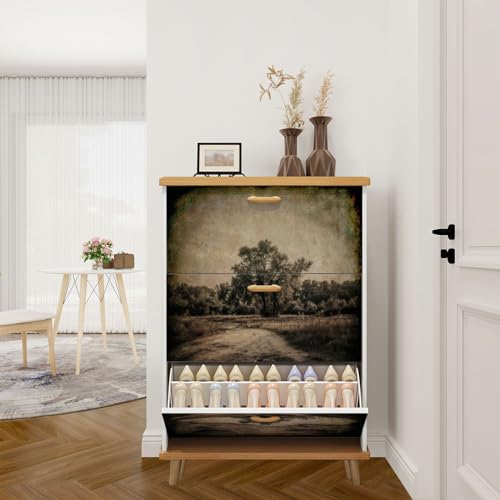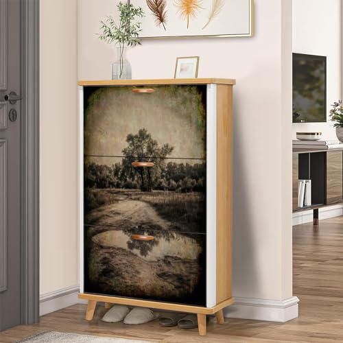 3 Drawer Shoe Cabinet, Artistic Shoe Cabinet, Mid Century Modern Mountain Birch Art Wood Shoe Rack Organizer for Entryway Slim (31.5”W x 9.45”D 46”H)