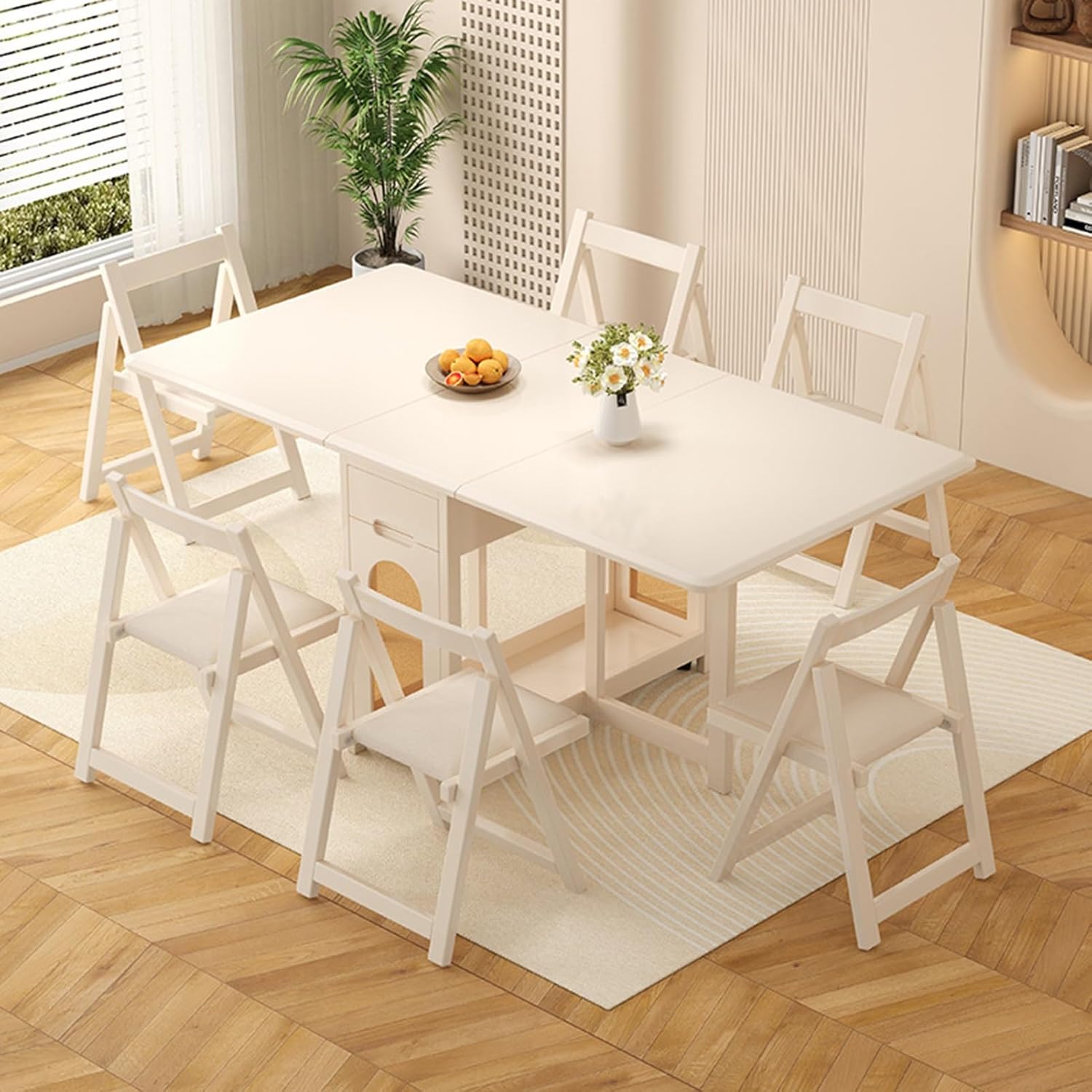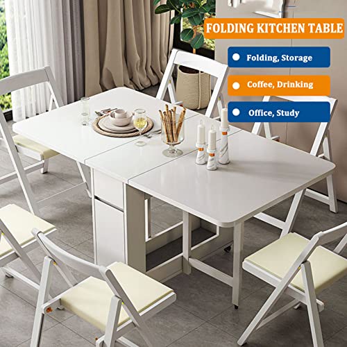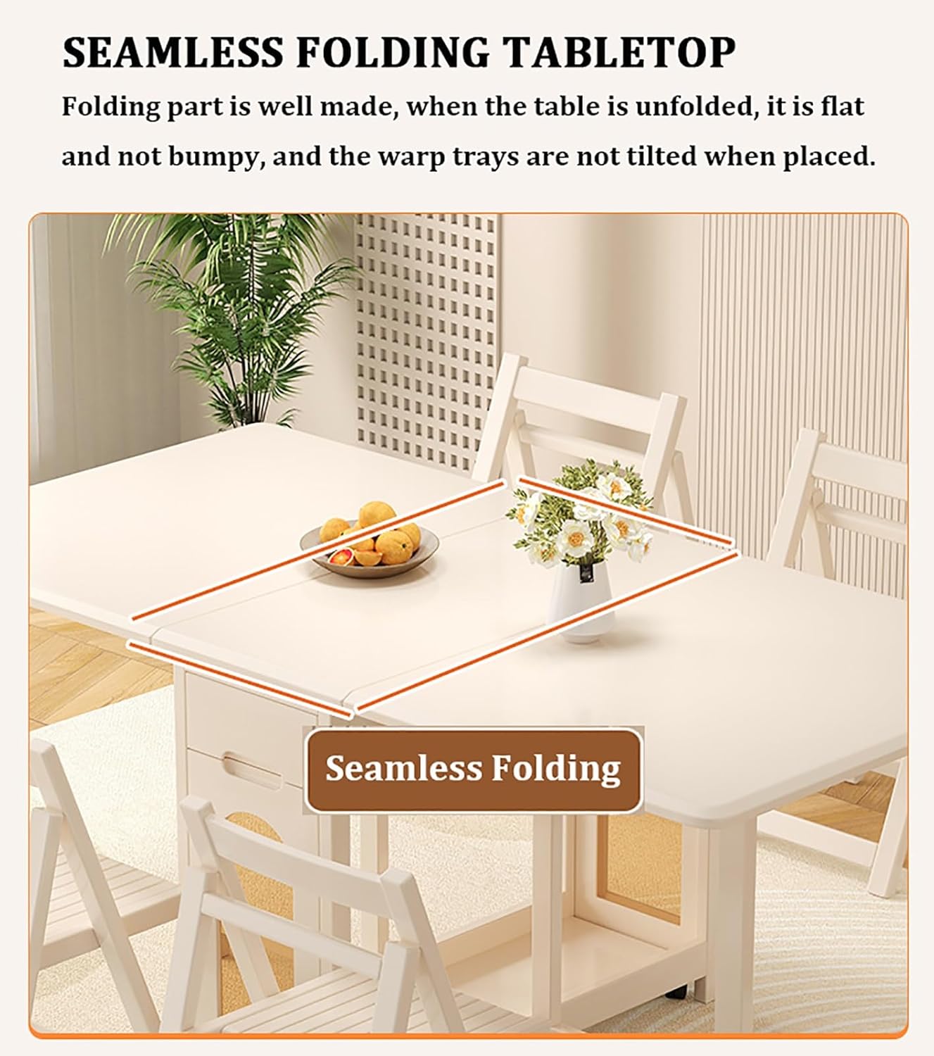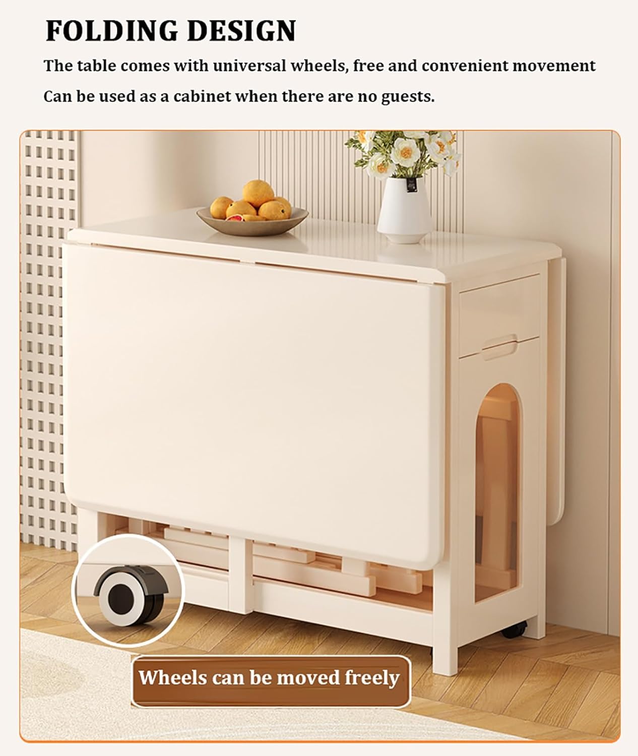 Folding Dining Table with Chairs Rack and 1 Storage Drawers, Movable Extendable Space Saving Table, 4 Universal Wheels, for Dining Room, Kitchen, Living Room