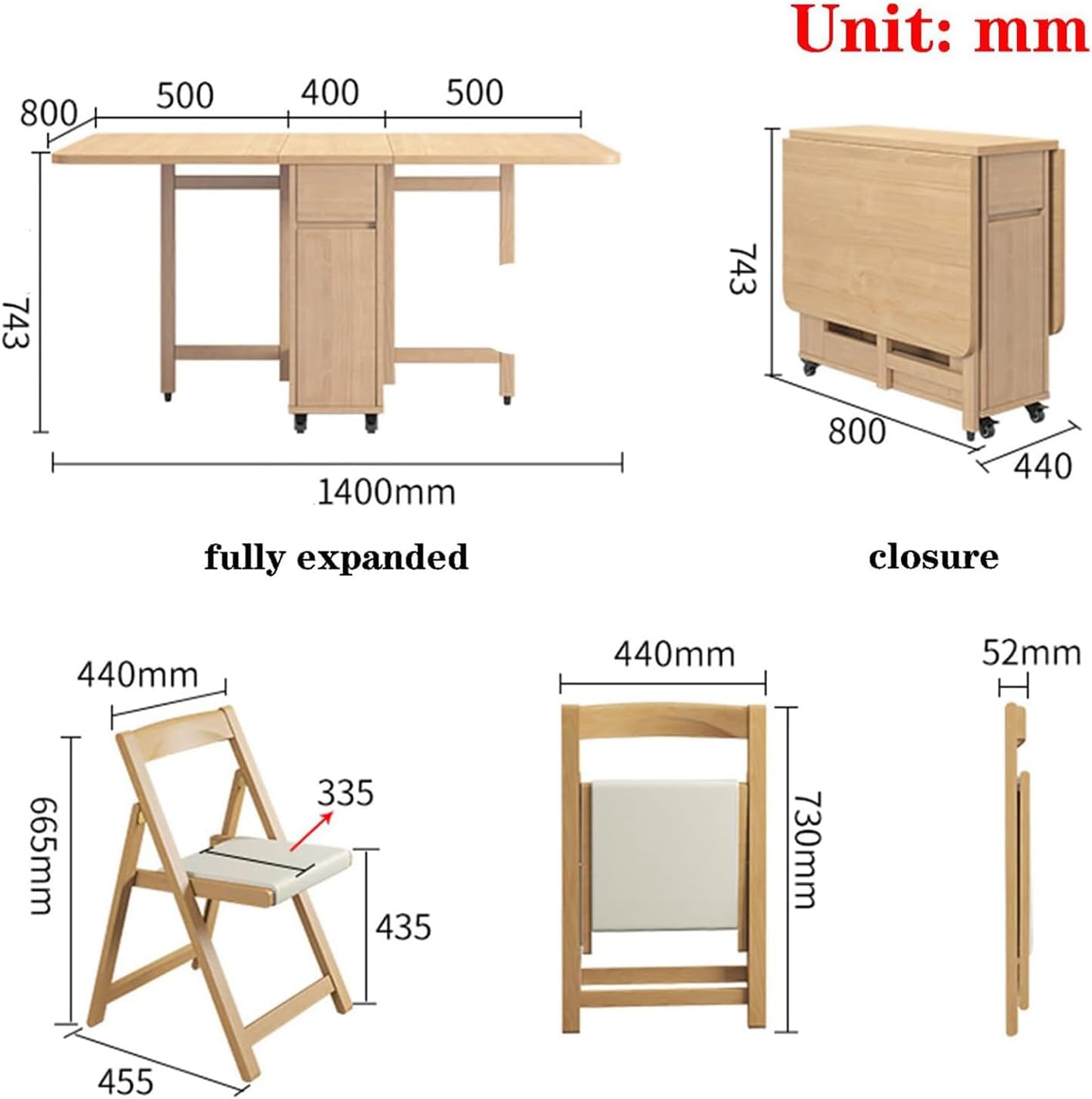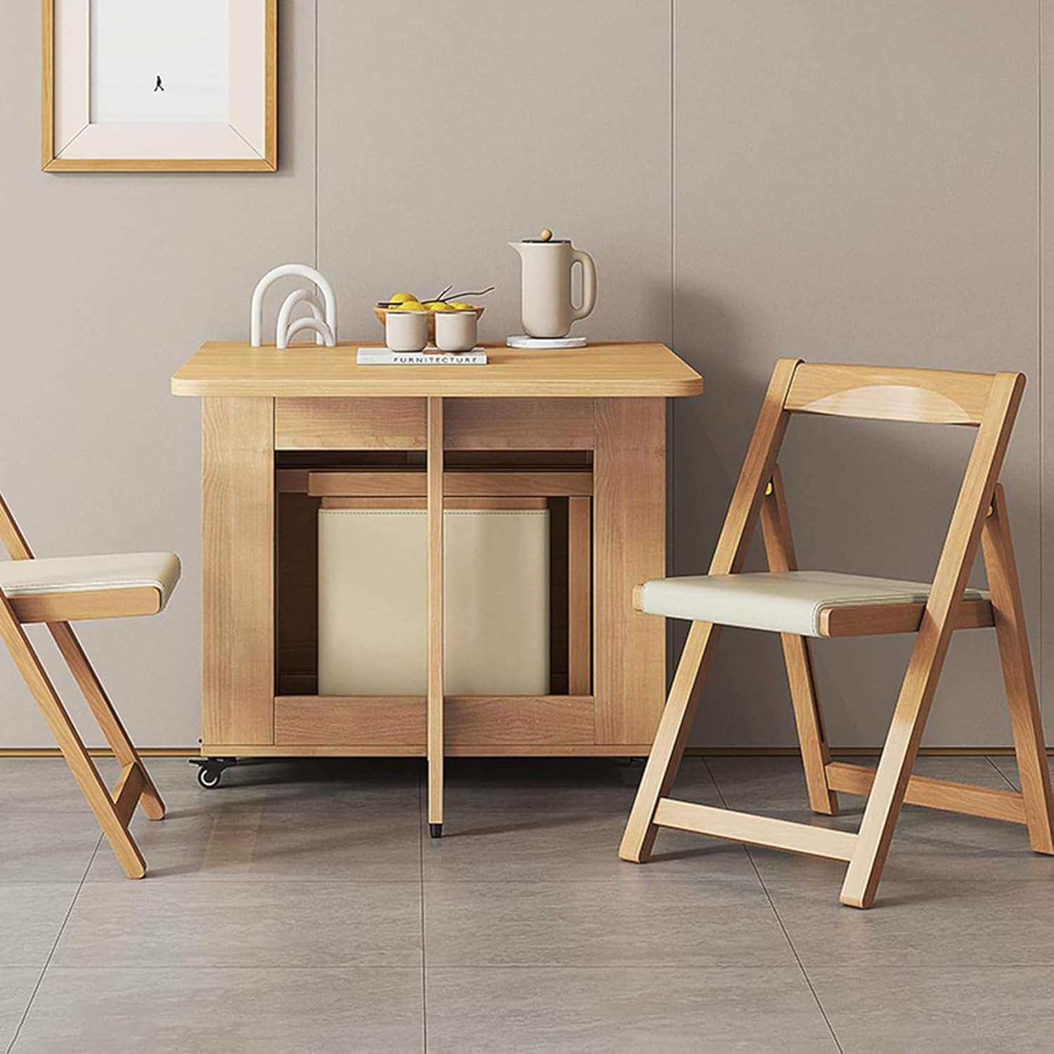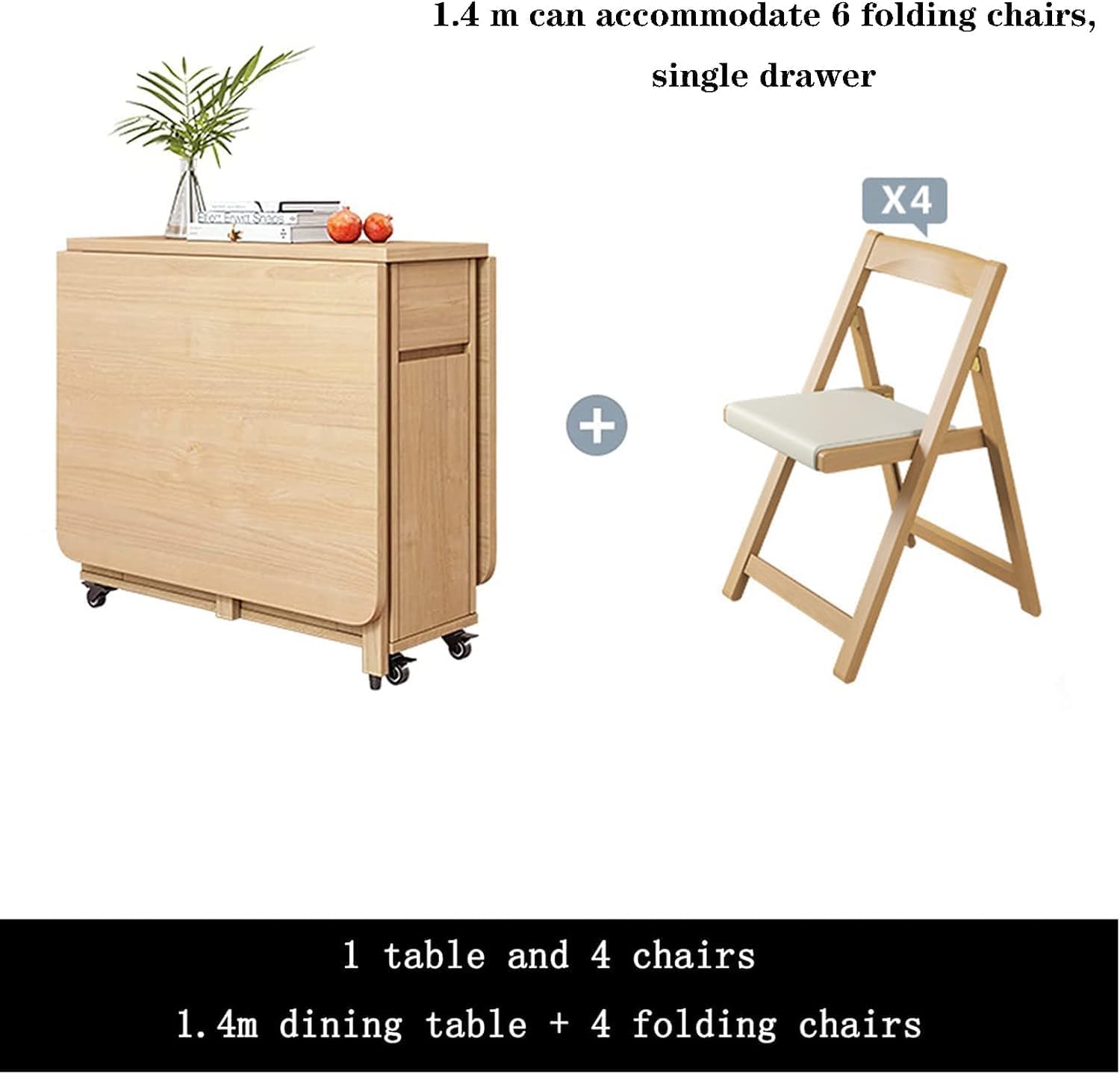 Folding Dining Table and Chairs, Solid Wood Drop Leaf Table Set, 1.4m Extendable Table with Chairs, Space Saving Foldable Table for Kitchen Living Room, Beige
