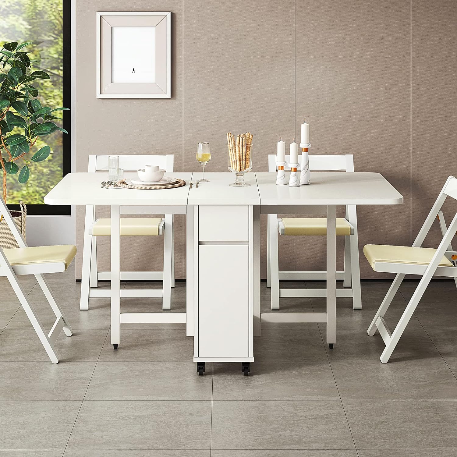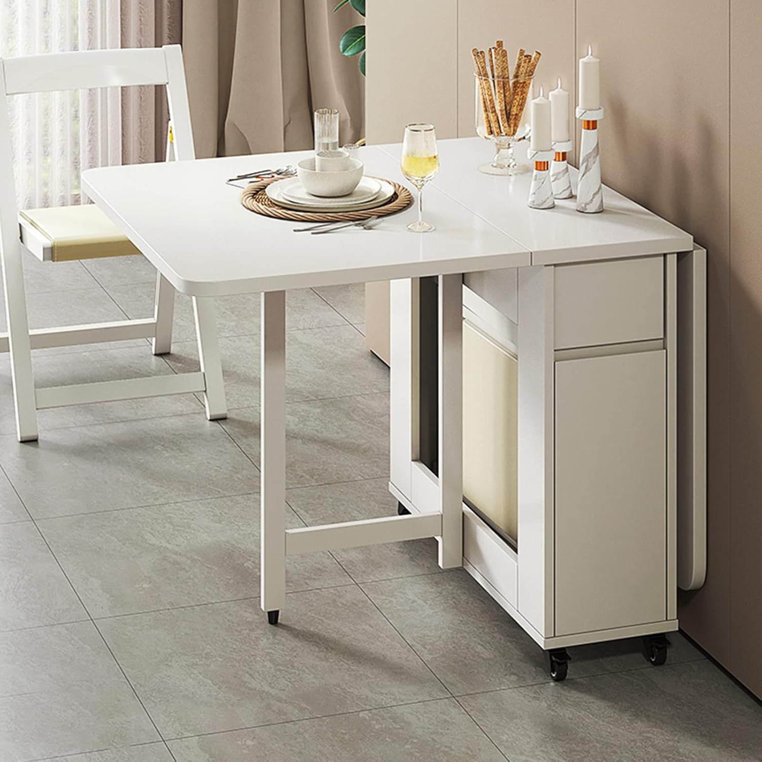 Extendable Dining Table Set, Dining Table with 4 Chairs, Solid Wood Kitchen Table, Space Saving Compact Folding Dining Room Table, for Home Dining Room Kitchen, White