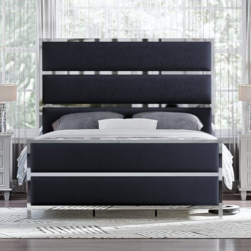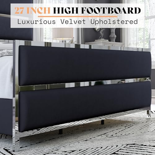 AMERLIFE King Size Bed Frame, Velvet Upholstered Bed with Silver Trim Headboard & Footboard, Channel Tufted Platform Bed Frame, No Box Spring Needed/Light Grey