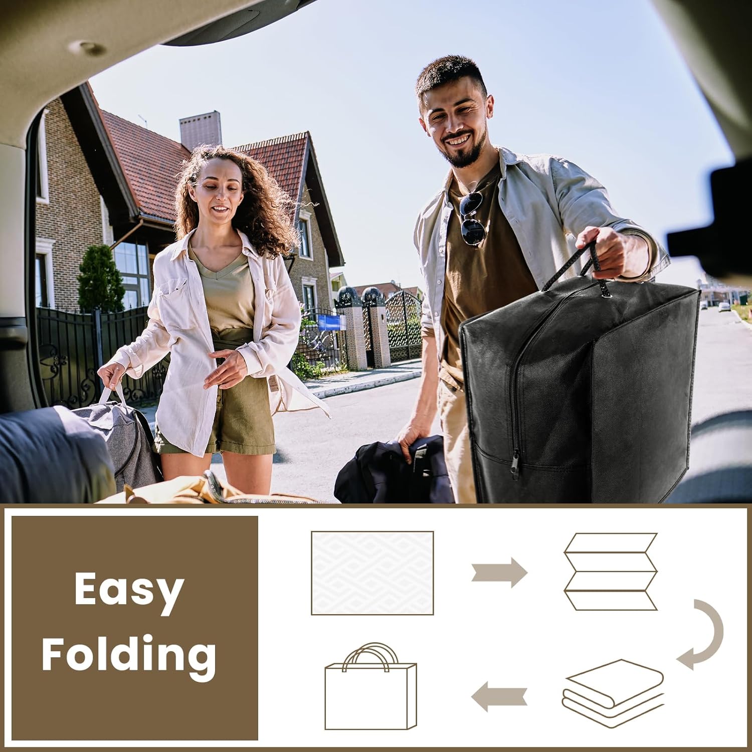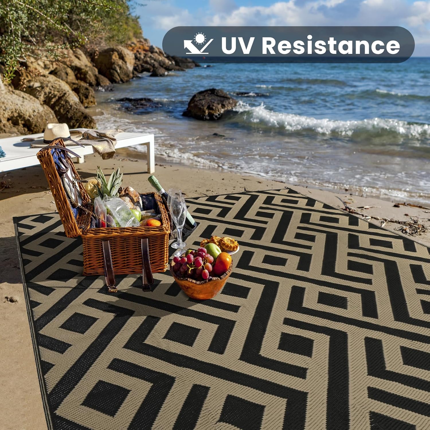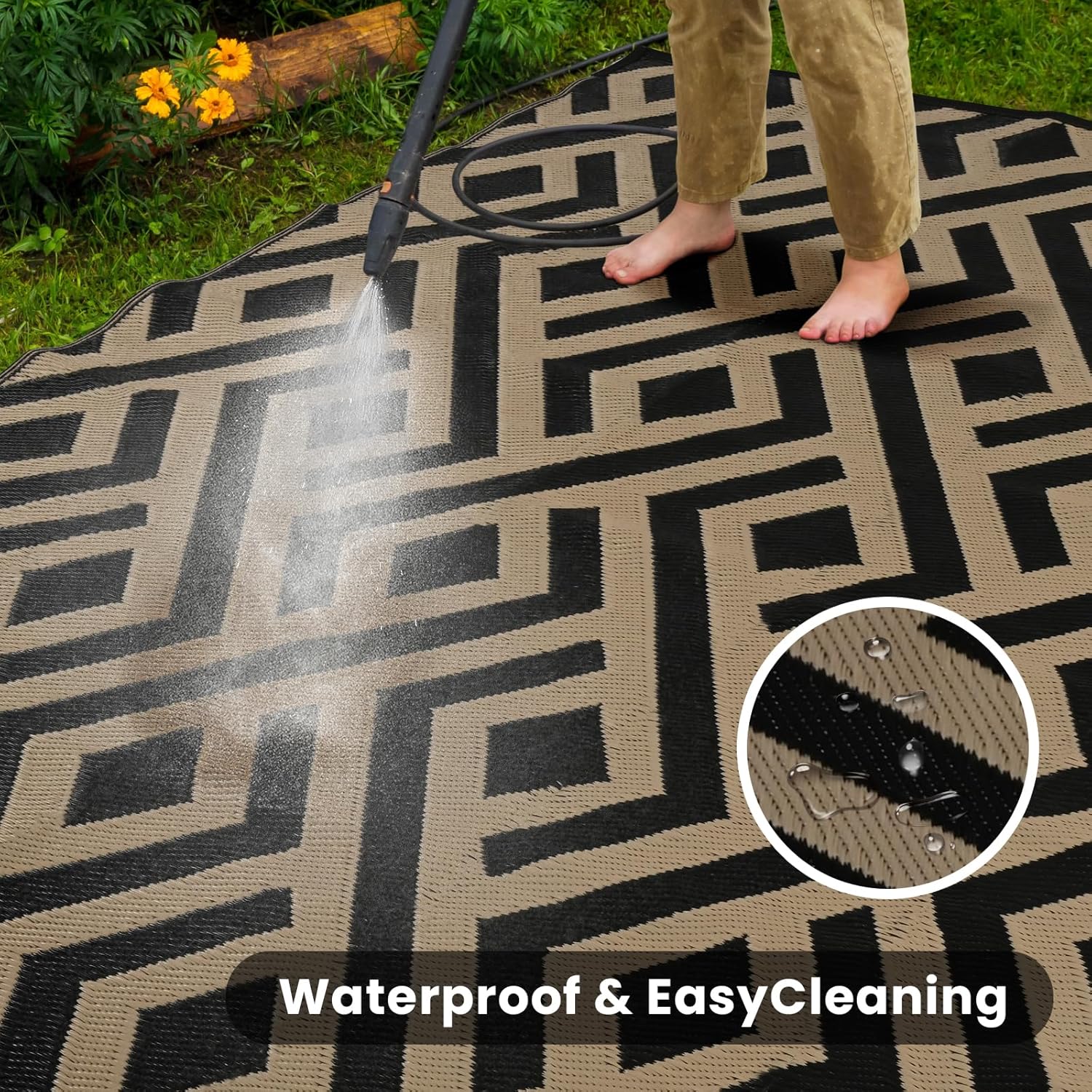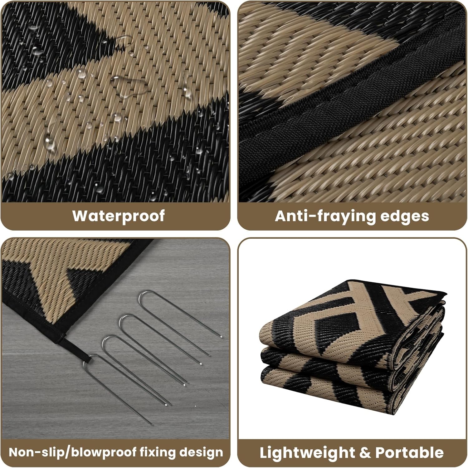 6x9 Outdoor Patio Rug with Carry Bag, Waterproof Outdoor Plastic Straw Rug RV Camping Rug, Reversible Picnic Mat Outside Carpet for Backyard, Porch, Balcony, Deck - Black & Beige