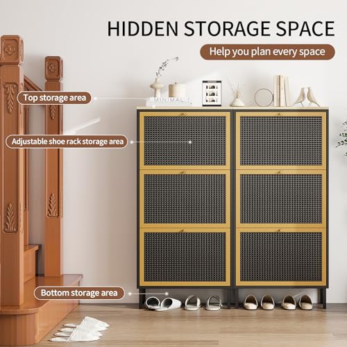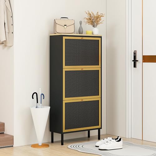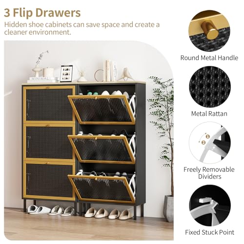 Natural Rattan Shoe Cabinet with 3 Flip Drawers, Organizer Freestanding Wooden Shoe Rack, Hidden Shoe Cabinet Storage Cabinet with Metal Legs for Entryway Hallway Bedroom (Natural, Set of 1)