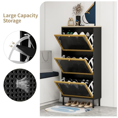 Rattan Shoe Storage Cabinet with 3 Flip Drawers, Freestanding Organizer with Adjustable Shelves for Entryway, Narrow Shoe Rack Cabinet for Hallway, Easy Assembly, Oak