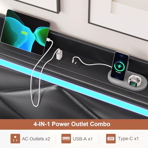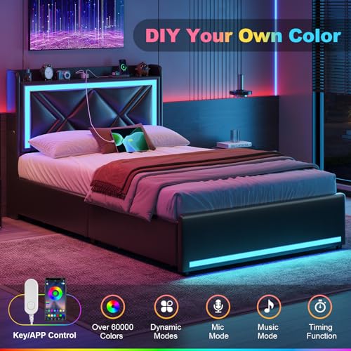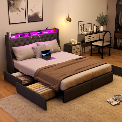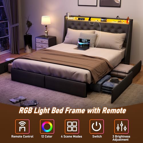 Queen Bed Frame with RGB LED Lights Headboard & USB-C/A Charging Station, Modern Upholstered Platform Bed with Storage Drawers, Heavy Duty Steel Slats, No Box Spring Needed, Dark Gray