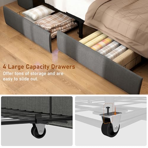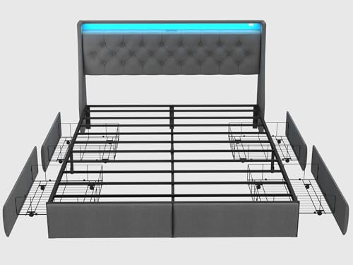SADENICEL Queen Bed Frame with Storage Headboard and 4 Drawer, Metal Platform Bed Frame Queen Size with LED Light, Charging Station, No Box Spring Needed, Noise Free, Easy Assembly, Grey