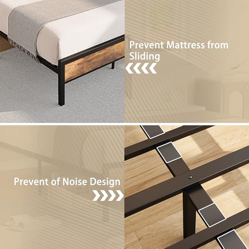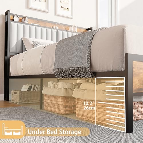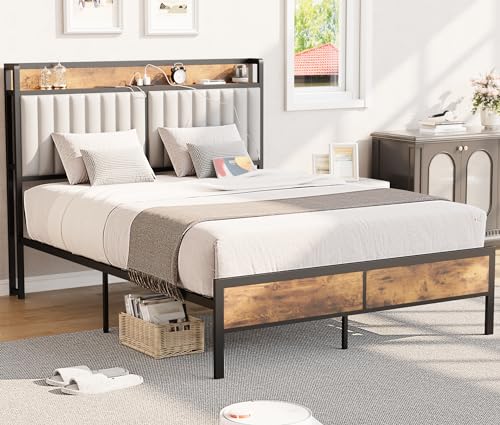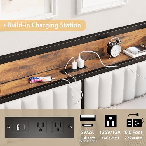 Queen Bed Frame with Headboard Upholstered,Metal Platform with Under-Bed Storage,Built-in Charging Station & LED, Noise-Free, Metal Support, No Box Spring Needed, Vintage Brown&White